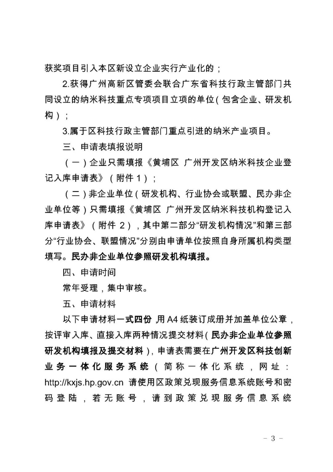 为深入实施创新驱动发展战略,进一步提升我区纳米产业创新能力及创新环境,集中优质资源对纳米科技企业给予重点支持,规范区纳米科技企业(机构)登记入库申报工作,根据《广州市黄埔区 广州开发区促进纳米产业发展办法》(穗埔府规〔2019〕32号)和《广州市黄埔区 广州开发区促进纳米产业发展办法实施细则》(穗埔科规字〔2020〕2号),我局制定了《黄埔区 广州开发区纳米科技企业(机构)登记入库申报工作指南(2020年版)》,现予以公布,自印发之日起执行。本工作指南将根据实际执行情况进行合理调整,最新版本以广州开发区科技创新业务一体化服务系统(http://kxjs.hp.gov.cn请使用区政策兑现服务信息系统账号和密码登陆,若无账号,请到政策兑现服务信息系统http://zcdx.gdd.gov.cn进行注册)公布为准。