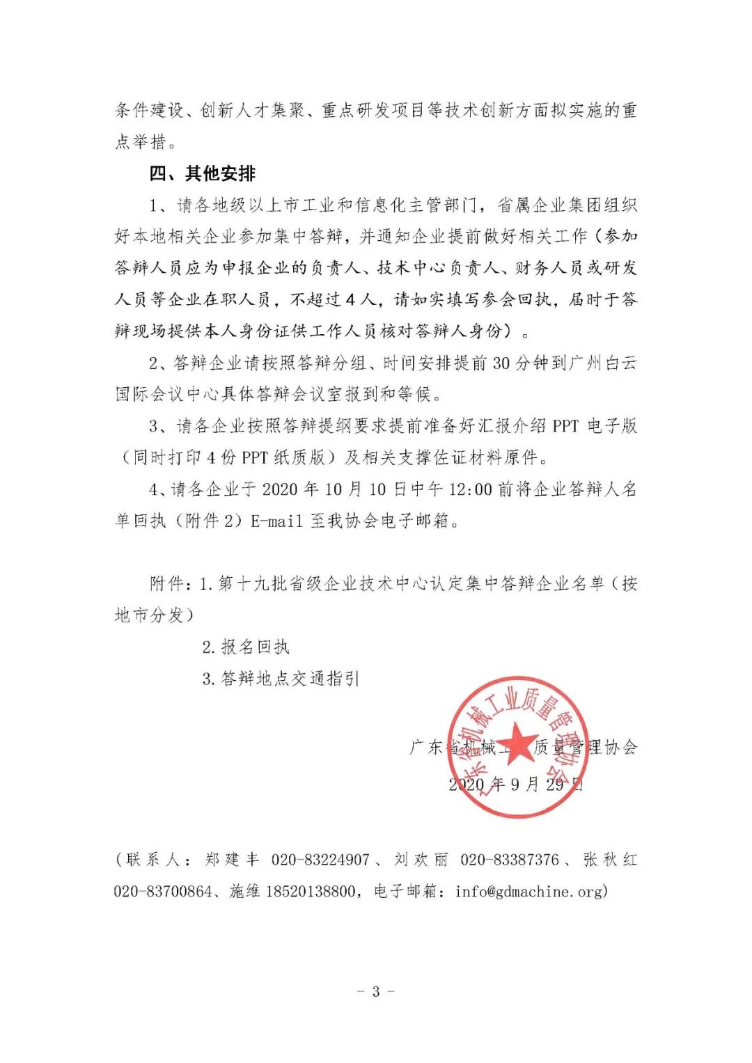 附件:1.关于开展广东省第十九批省级企业技术中心认定集中答辩的通知(粤机质协〔2020〕9号)