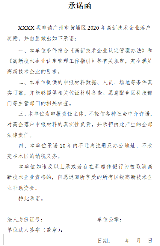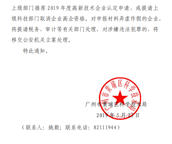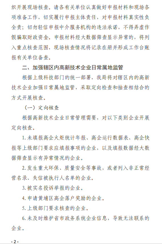 (三)申报企业应切实履行申报主体责任,不相信中介的虚假承诺,对申报材料、人员、场地等要素的真实性负责,不得弄虚作假。根据《广州市黄埔区科学技术局关于加强高新技术企业日常管理工作的通知》(穗埔科〔2019〕37号,附件3),我局将对申请我区高新技术企业落户奖励的企业实行定向核查,采取材料审核、现场审核等形式组织开展,具体开展时间及形式另行通知。