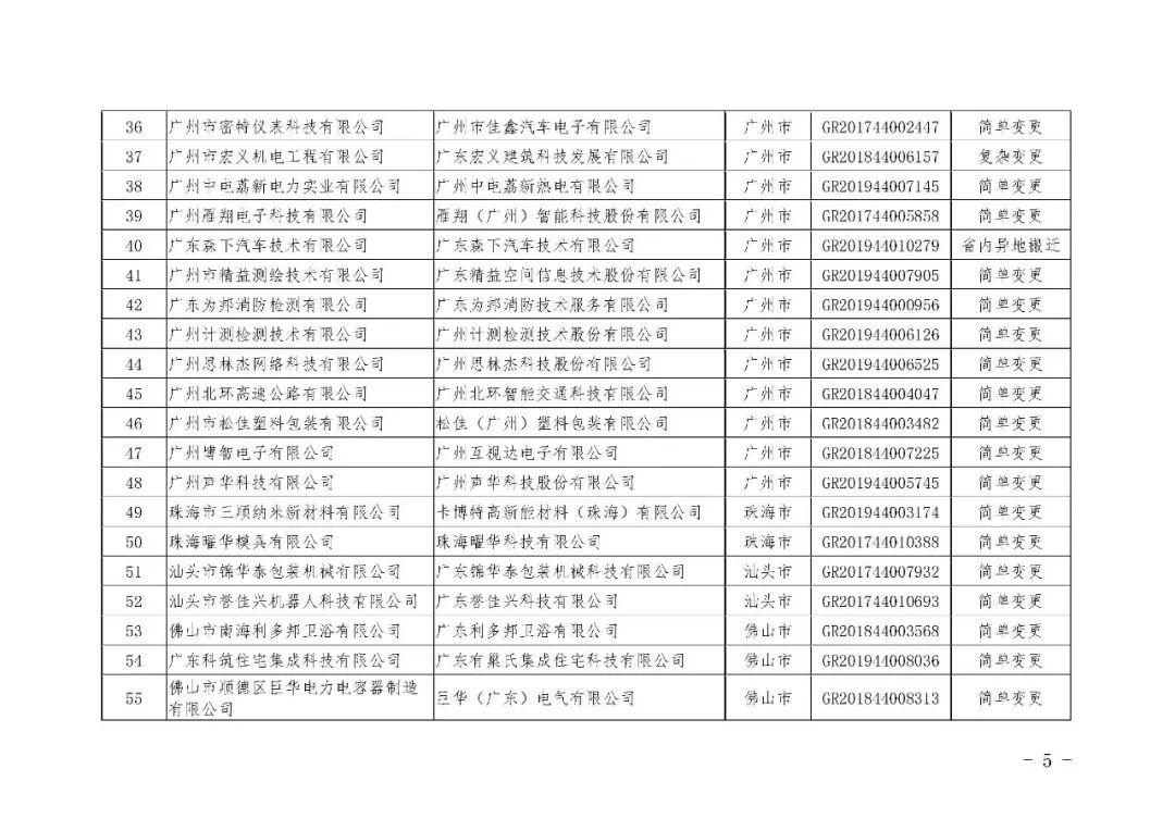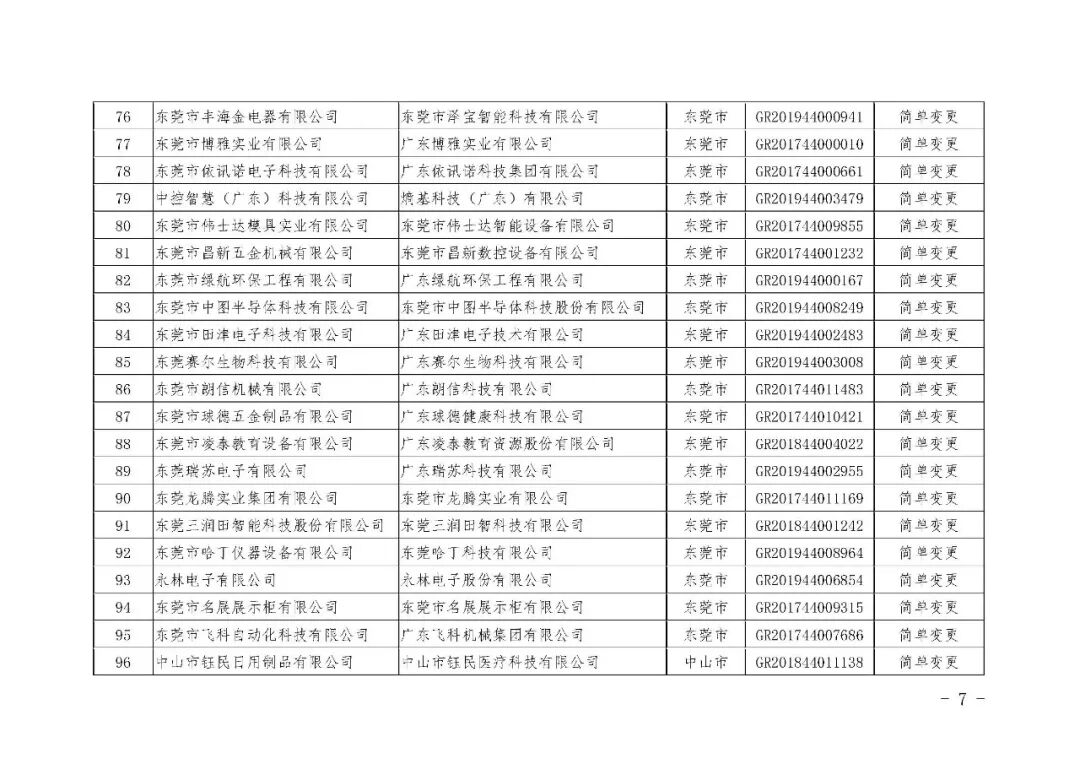 根据《科技部财政部国家税务总局关于修订印发〈高新技术企业认定管理办法〉的通知》(国科发火〔2016〕32号)和《科技部财政部国家税务总局关于修订印发〈高新技术企业认定管理工作指引〉的通知》(国科发火〔2016〕195号)的有关要求,经企业申请、专家评审和公示,广东华海建设有限公司等114家企业发生变更后仍符合高新技术企业认定条件,现予以公告。