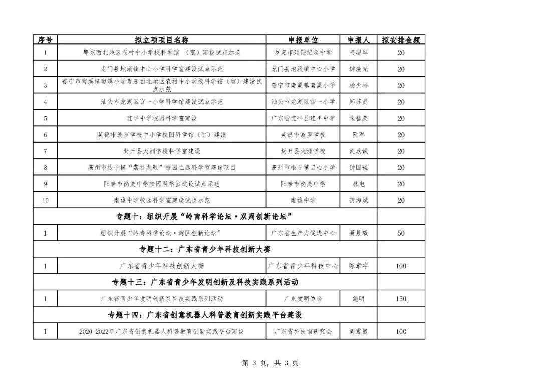 根据《广东省省级财政专项资金管理办法》有关规定,拟安排2021年科技创新普及专题、孵化育成体系项目172项,拟安排项目经费5350.48万元。其中,科技创新普及专题项目42项1300万元,孵化育成体系项目130项4050.48万元。现予以公示,公示期自2021年2月18~24日。