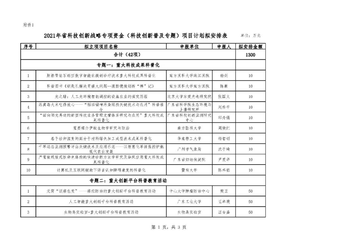 附件:1.2021年省科技创新战略专项资金(科技创新普及专题)项目计划拟安排表