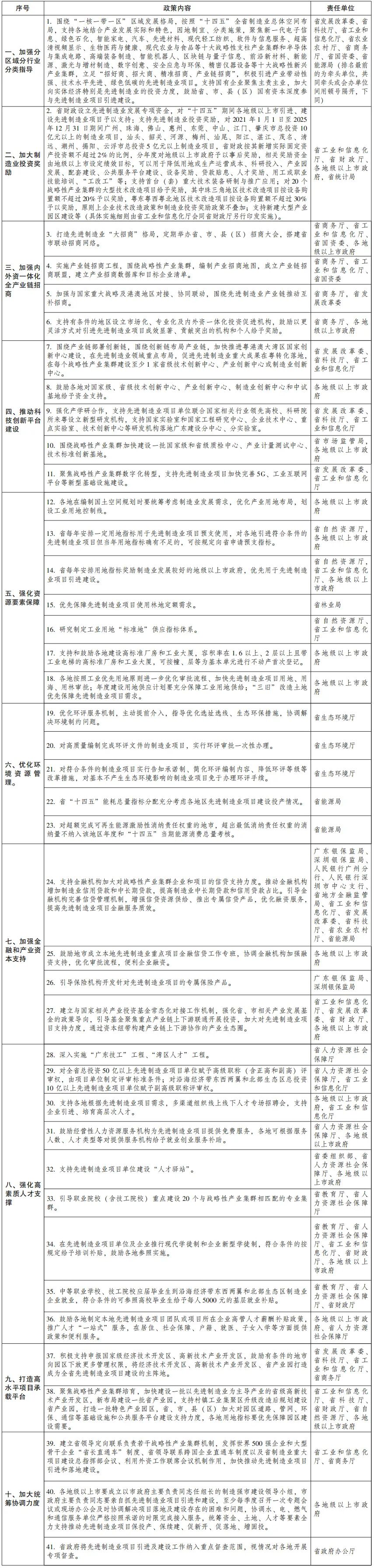 省财政设立先进制造业发展专项资金,对“十四五”期间各地级以上市引进、建设先进制造业项目予以支持:支持先进制造业投资奖励,对2021年1月1日至2025年12月31日期间广州、珠海、佛山、惠州、东莞、中山、江门、肇庆市总投资10亿元以上的制造业项目,汕头、韶关、河源、梅州、汕尾、阳江、湛江、茂名、清远、潮州、揭阳、云浮市总投资5亿元以上制造业项目,省财政按其新增实际固定资产投资额不超过2%的比例,分年度对地级以上市政府予以事后奖励,相关奖励资金由地级以上市设定绩效目标,可以用于降低用地或生产运营成本、科研投入、产业园发展、配套建设、公共服务平台建设、设备奖励、贷款贴息、人才奖励、用工或职业技能培训、“工改工”等;支持首台(套)重大技术装备研制与推广应用;对20个战略性产业集群的大型技术改造项目给予奖励,其中珠三角地区技术改造项目按设备购置额不超过20%予以奖励,粤东粤西粤北地区技术改造项目按设备购置额不超过30%予以奖励,原则上企业技术改造政策和制造业投资奖励政策不叠加;支持新建大型产业园区建设等(具体实施细则由省工业和信息化厅会同省财政厅另行印发实施)。