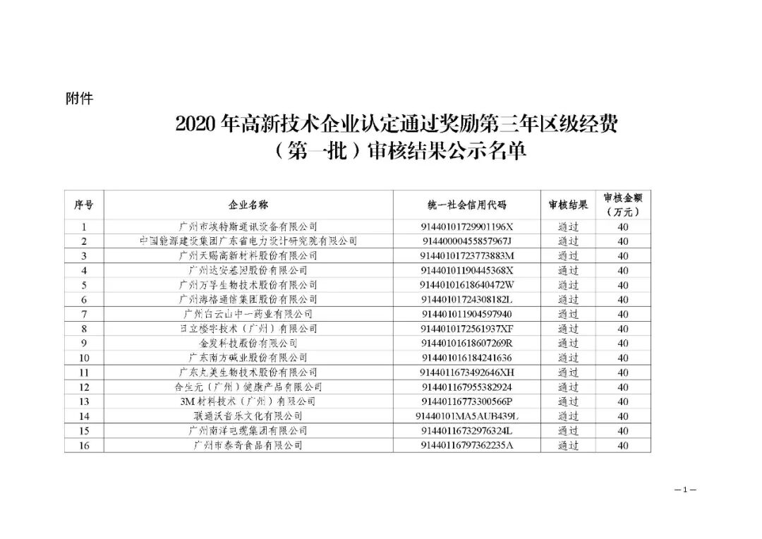 根据《广州市科技创新委员会关于印发广州市高新技术企业树标提质行动方案(2018—2020年)的通知》(穗科创规字〔2018〕1号)和《广州市黄埔区、广州开发区、广州高新区进一步促进高新技术产业发展办法》(穗埔府规〔2020〕4号)等相关文件规定,现对2020年高新技术企业认定通过奖励第三年区级经费(第一批)审核结果公示(见附件)。