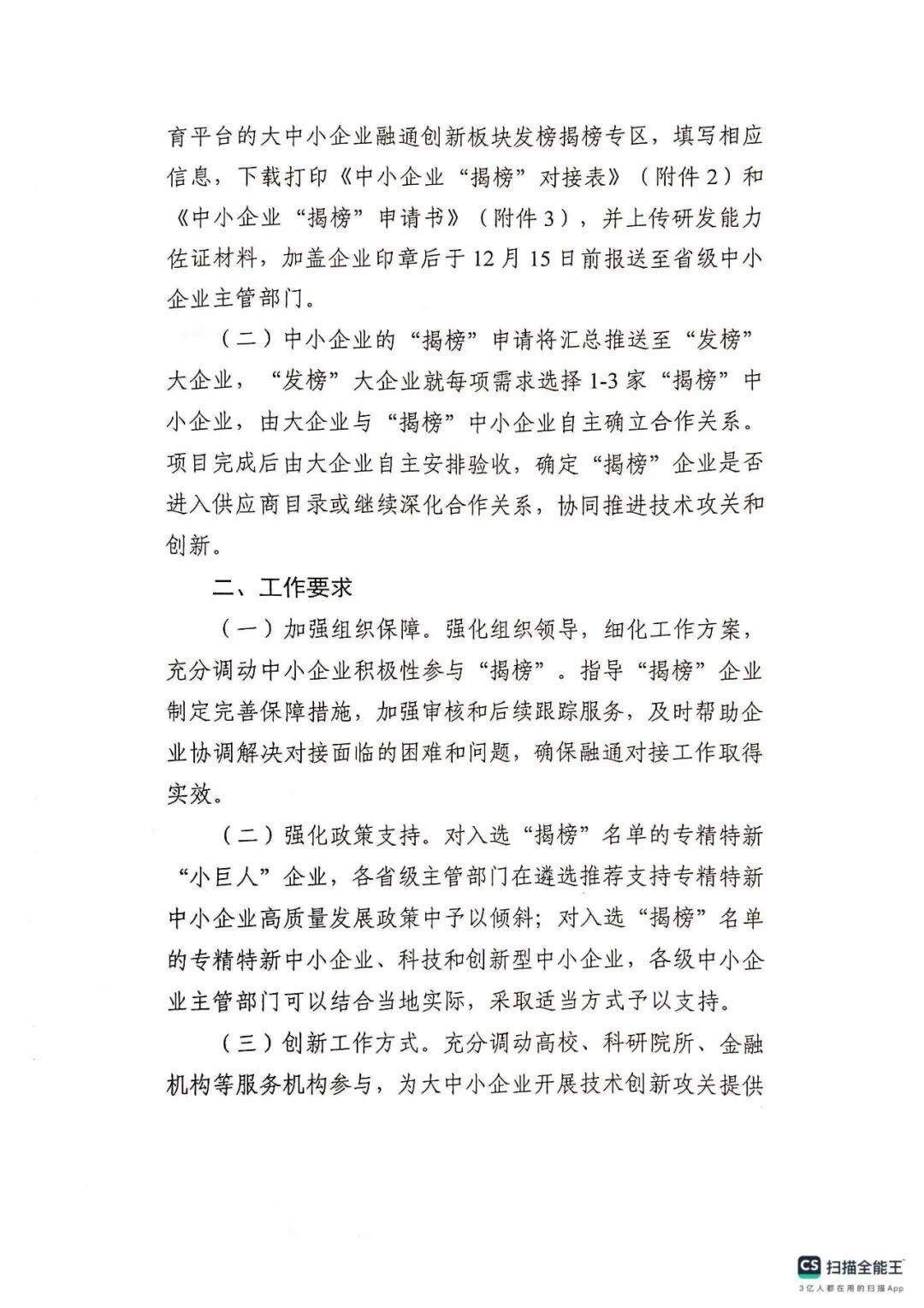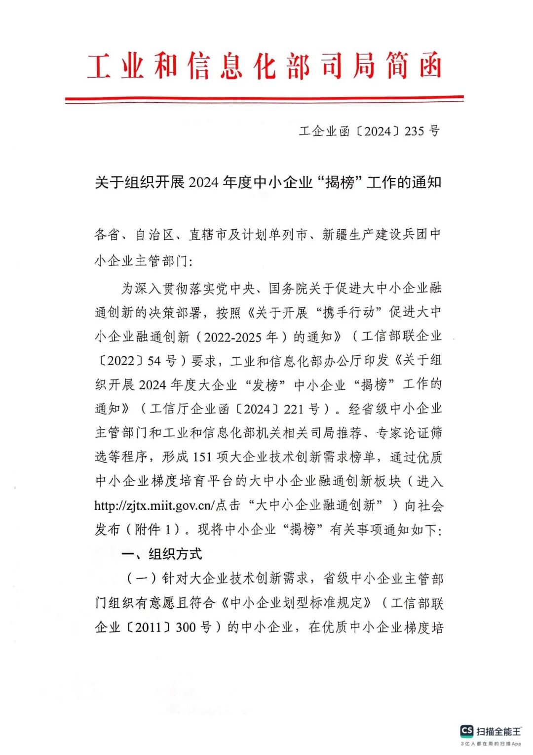 为深入贯彻落实党中央、国务院关于促进大中小企业融通创新的决策部署,工业和信息化部组织开展了2024年度大企业“发榜”中小企业“揭榜”工作,形成了151项大企业技术创新需求榜单,现将《关于组织开展2024年度中小企业“揭榜”工作的通知》(工企业函〔2024〕235号、附件1)转发你们,并就做好我省2024年度中小企业“揭榜”工作有关事项通知如下: