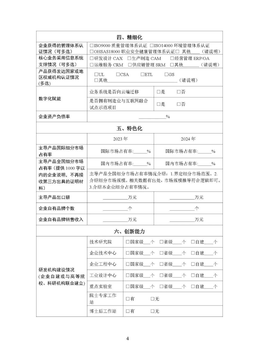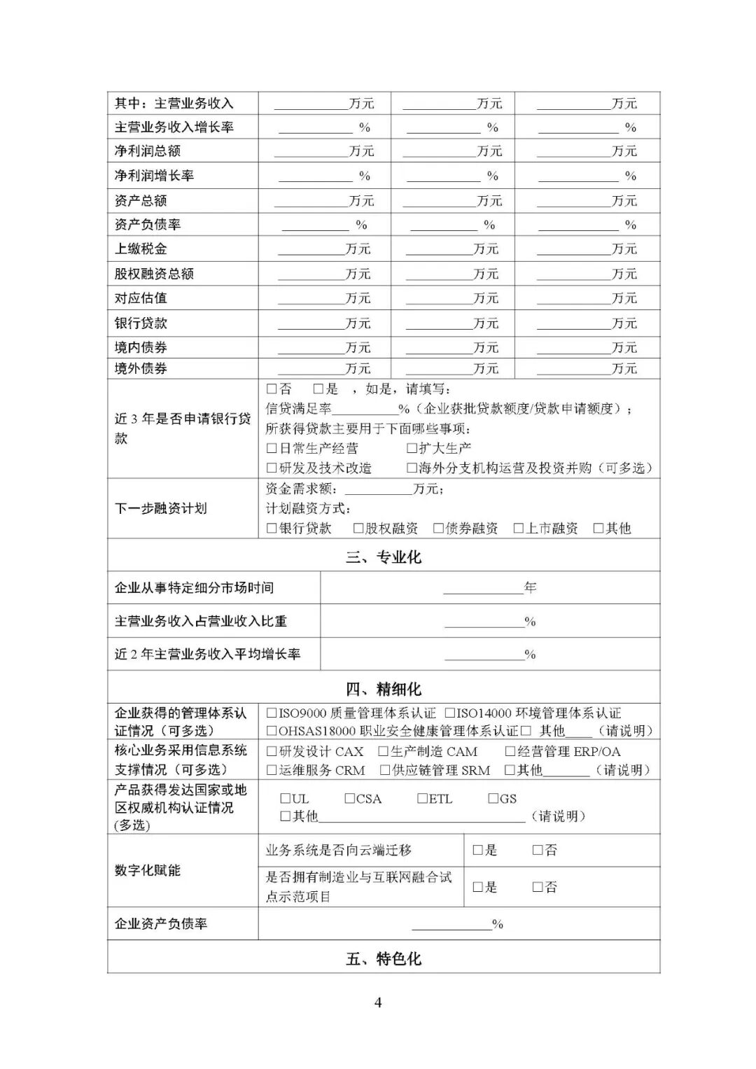 四、请参与预复核的企业于1月15日前提交《第四批专精特新“小巨人”企业预复核申报书》,参与预申报的企业于2月17日前提交《第七批专精特新“小巨人” 企业预报书》,上述材料均提供可编辑电子版(无需扫描、盖章)即可,并报送至政务邮箱:hpgxjzxc@gdd.gov.cn。