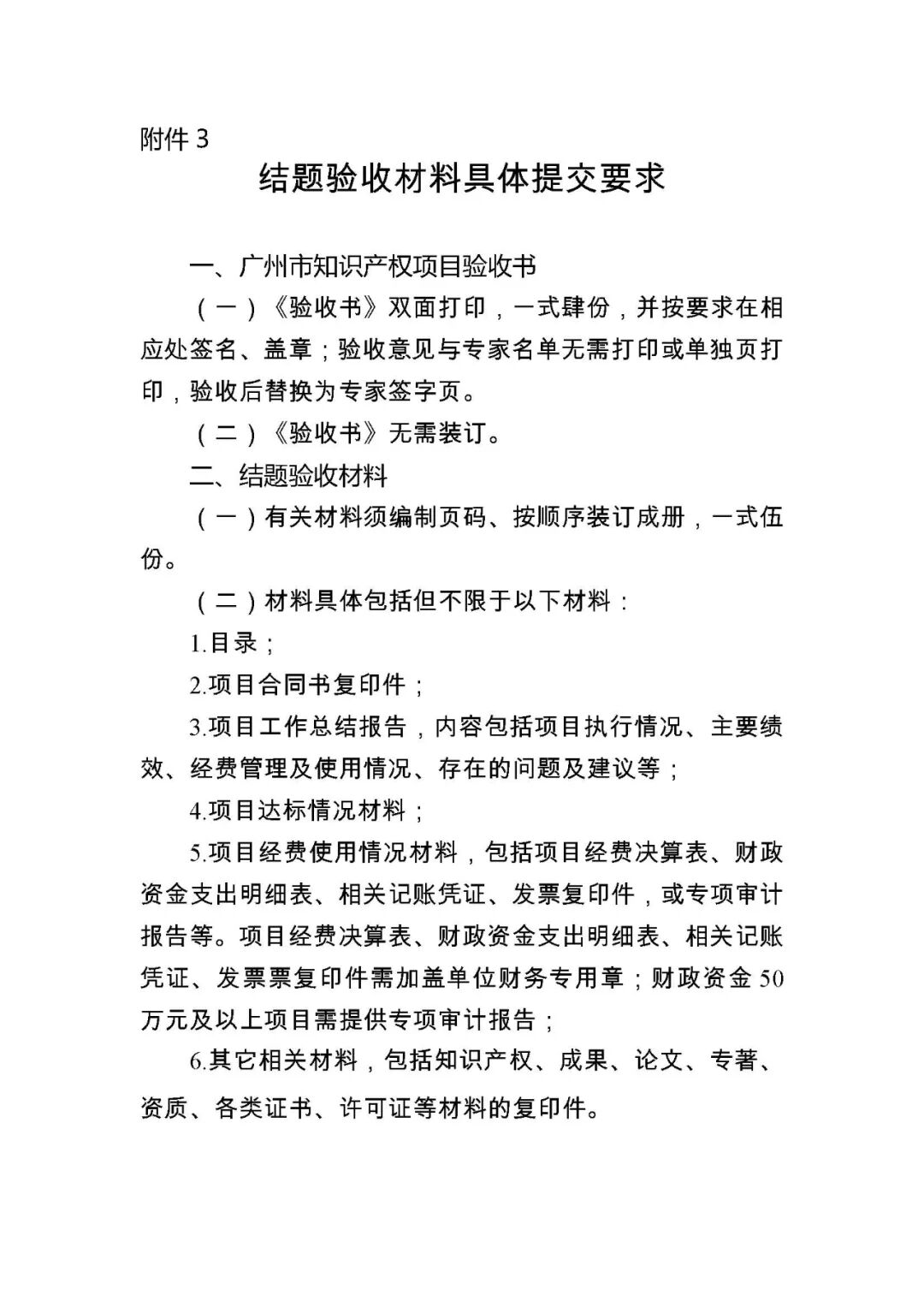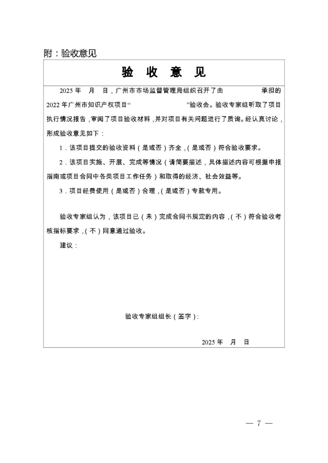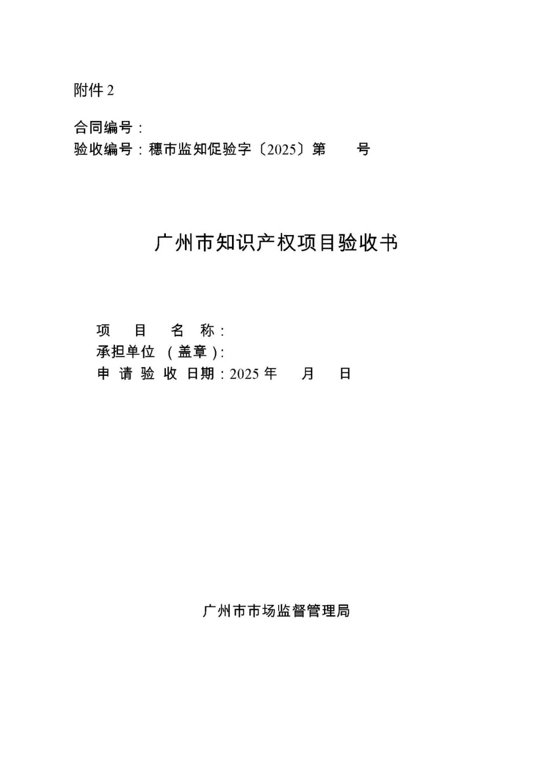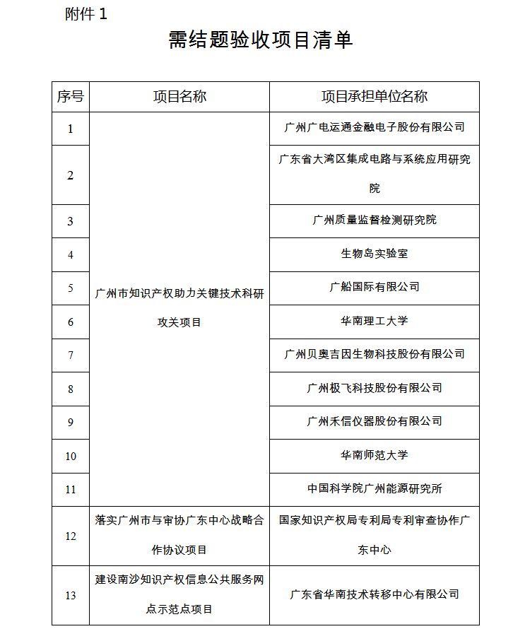 根据《广州市知识产权局关于印发广州市知识产权工作专项资金管理办法的通知》(穗知规字〔2023〕1号)和项目合同的要求,我局将组织开展2022年度省、市知识产权项目(促进类)验收工作。现将有关事项通知如下: