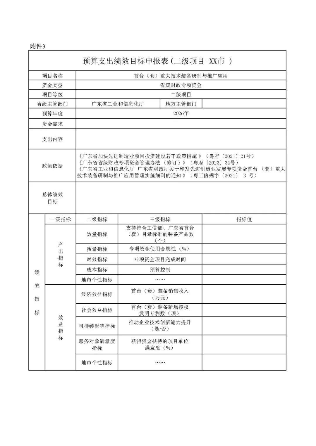 根据《广东省工业和信息化厅省级财政资金项目库管理办法》(粤工信办函〔2020〕25号)、《广东省工业和信息化厅 广东省财政厅关于先进制造业发展专项资金首台(套)重大技术装备研制与推广应用管理实施细则》(粤工信规字〔2021〕3号)、《广东省省级财政专项资金管理办法(修订)》(粤府〔2023〕34号)等文件和省财政厅关于做好2026年省级财政资金项目入库储备工作的要求,现就2026年省级首台(套)重大技术装备研制与推广应用项目入库储备工作通知如下: