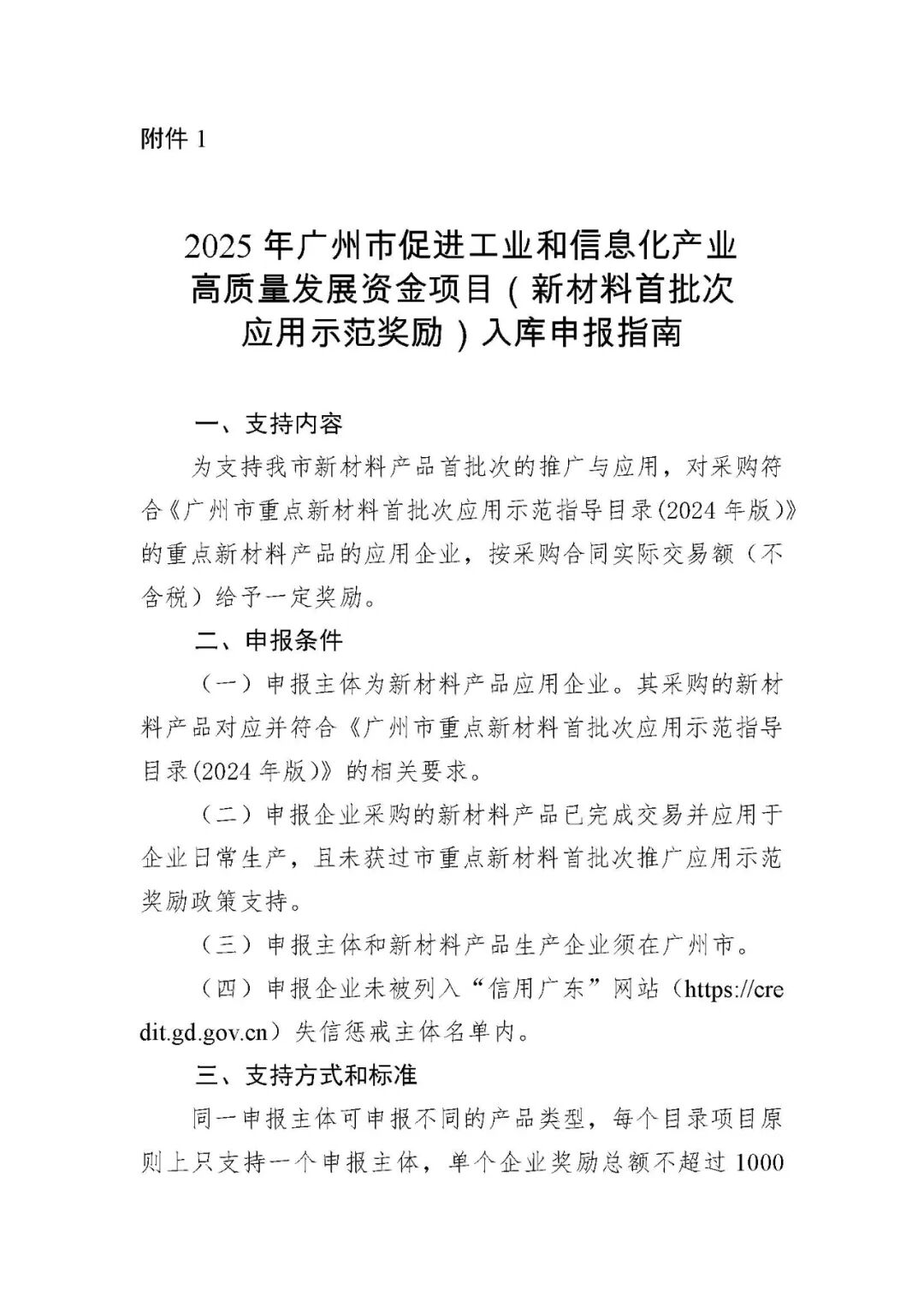 1.2025年广州市促进工业和信息化产业高质量发展资金项目(新材料首批次应用示范奖励)入库申报指南