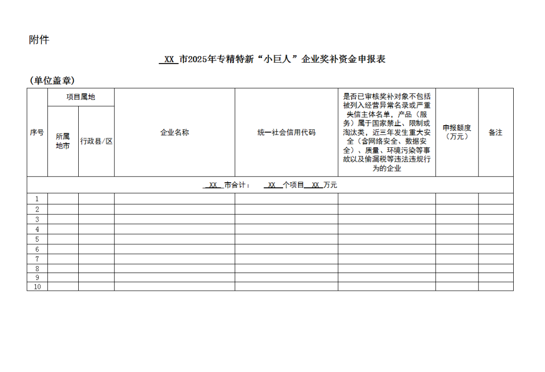 附件:XX市2025年专精特新“小巨人”企业奖补资金申报表
