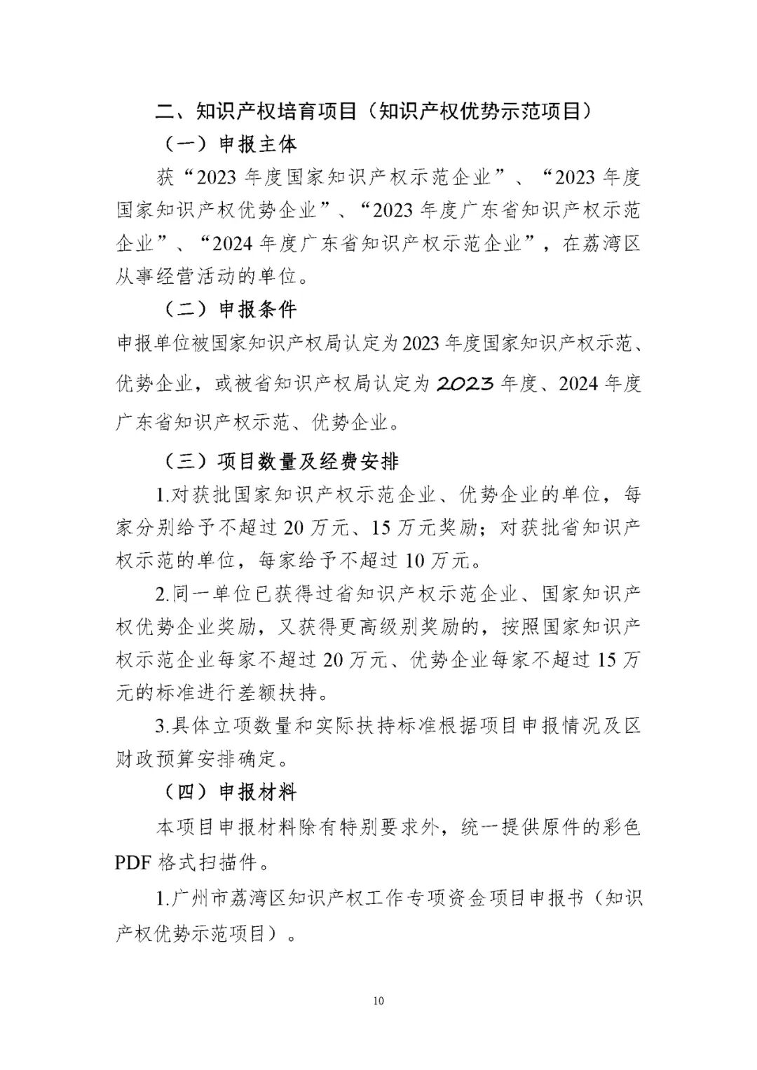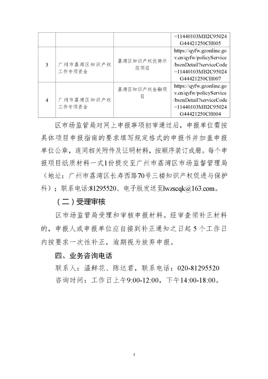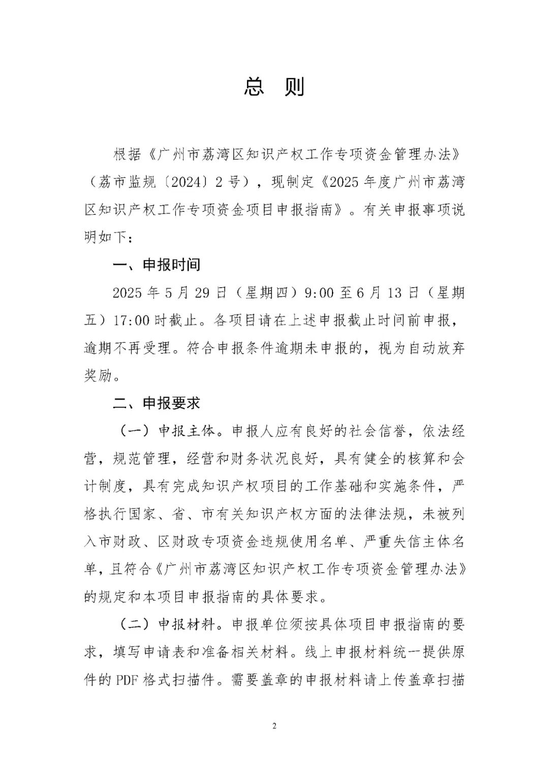 为做好2025年度荔湾区知识产权工作专项资金项目申报工作,根据《广州市荔湾区知识产权工作专项资金管理办法》(荔市监规〔2024〕2号)有关要求及工作安排,现印发《2025年度广州市荔湾区知识产权工作专项资金(第一批)申报指南》,请符合条件的单位按照文件要求积极申报,进一步推动荔湾区知识产权工作。