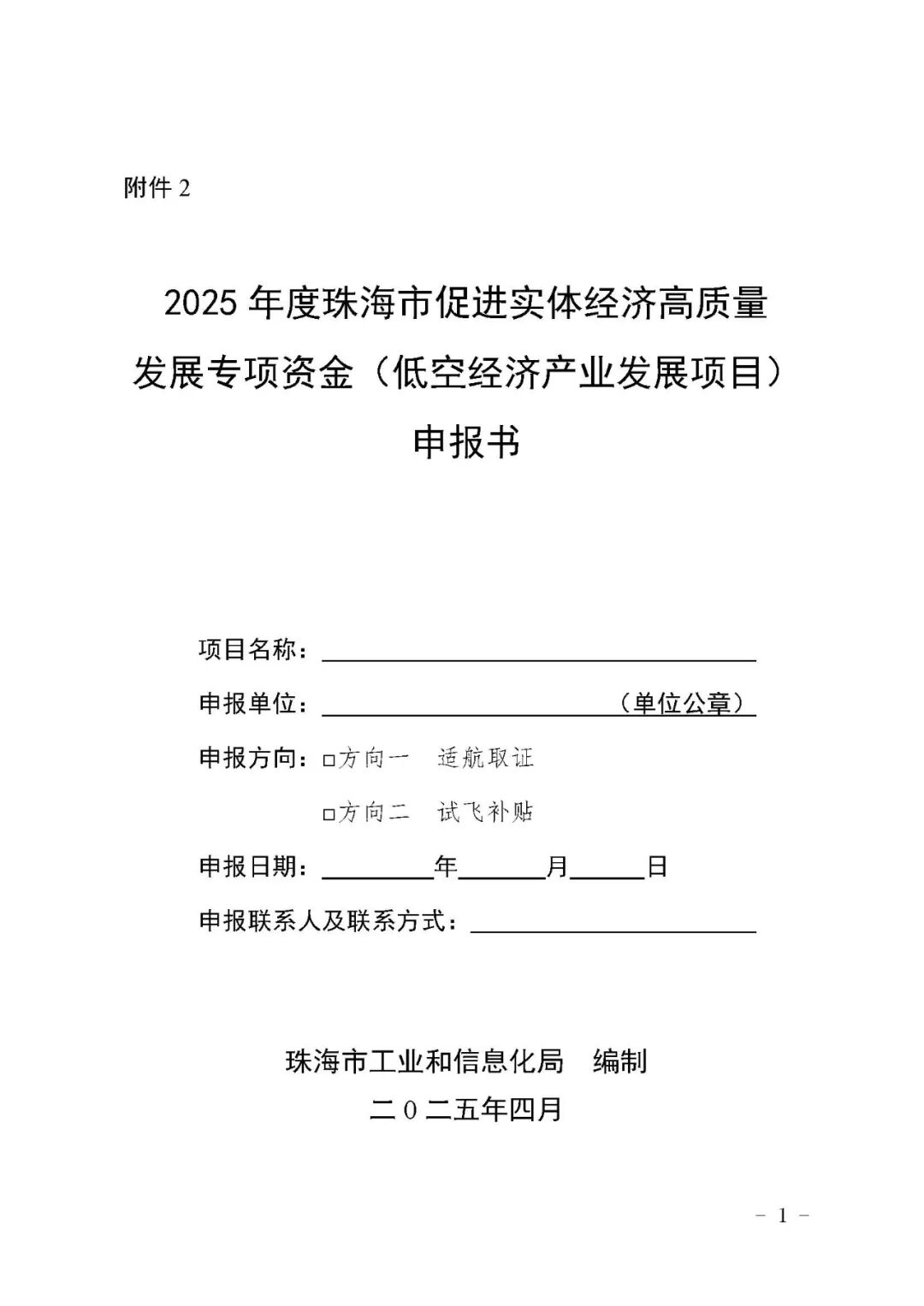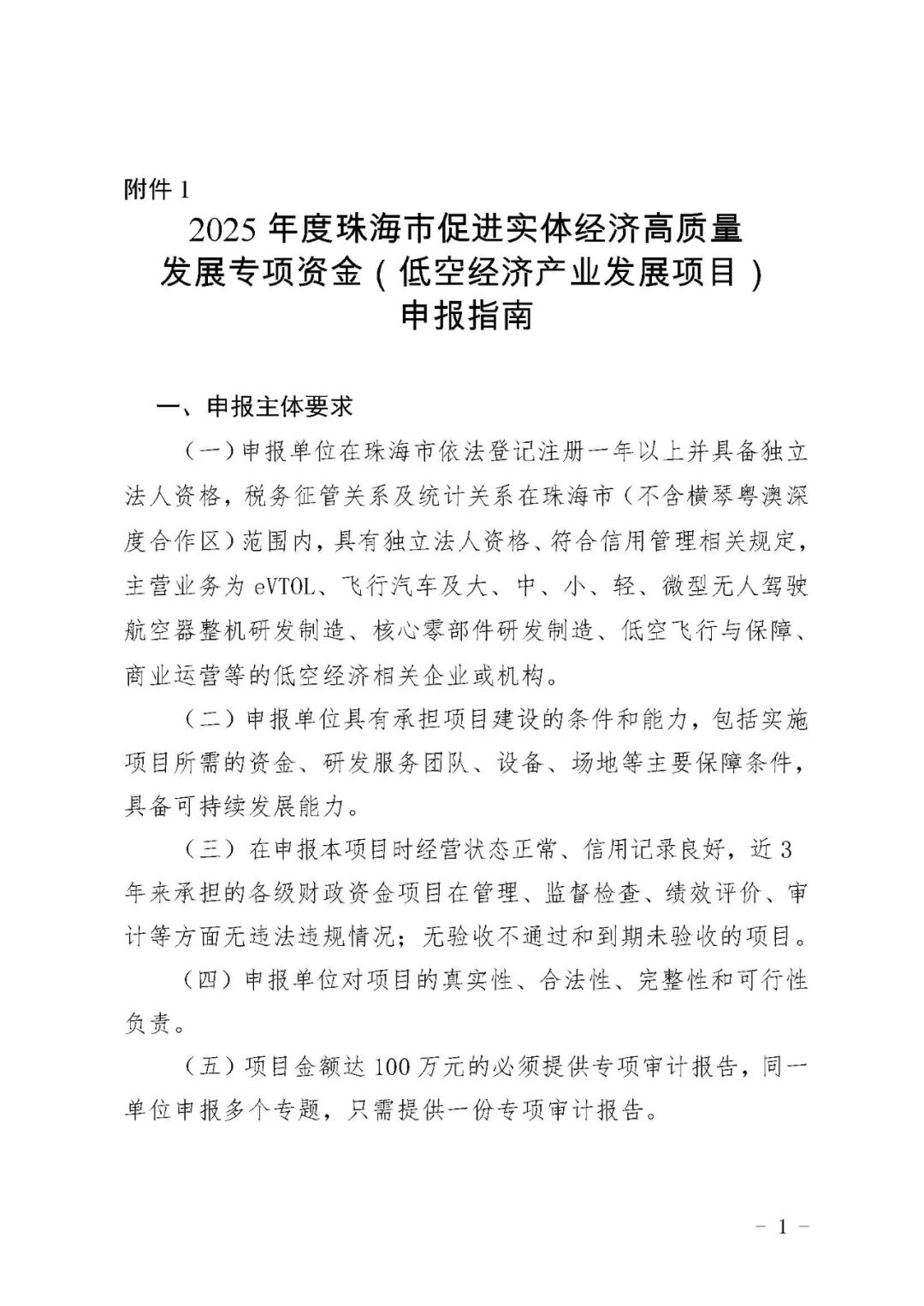 附件:1.2025年度珠海市促进实体经济高质量发展专项资金(低空经济产业发展项目)申报指南