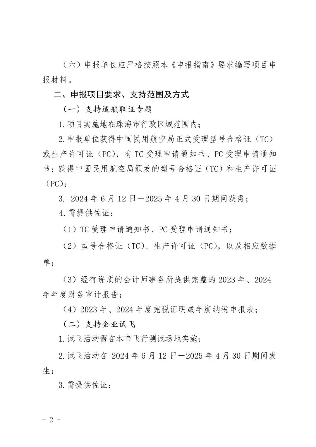 本次2025年度珠海市低空经济产业发展项目征集包括支持适航取证和支持企业试飞两个专题,《珠海市人民政府关于印发支持低空经济高质量发展若干措施的通知》中其他支持措施申报要求以相关责任单位通知为准。