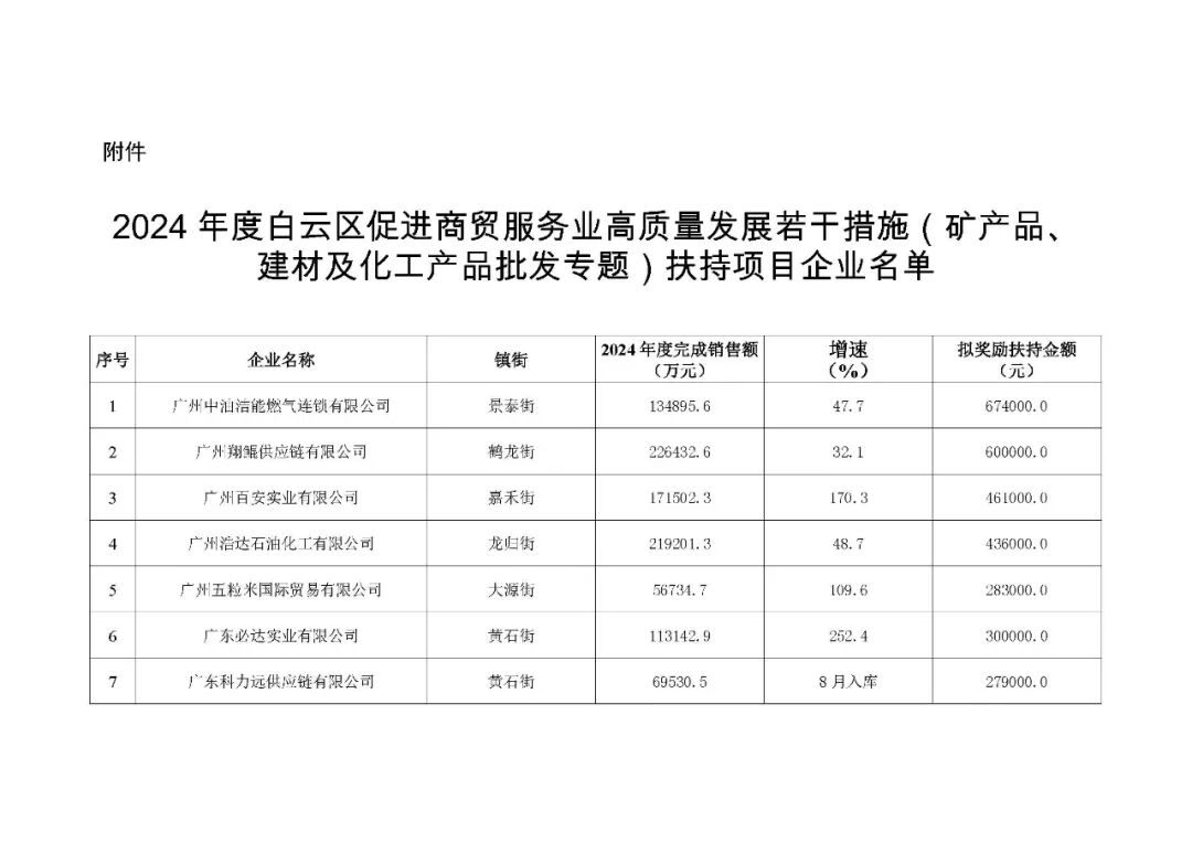 根据工作安排,现对广州中油洁能燃气连锁有限公司等17家符合《广州市白云区人民政府办公室关于印发广州市白云区促进商贸服务业高质量发展的若干措施的通知》(云府办〔2023〕128号)中第七条“支持大宗商品交易企业(现货交易)”的扶持奖励企业名单予以公示,公示时间为2025年6月9日至2025年6月13日(5个工作日)。