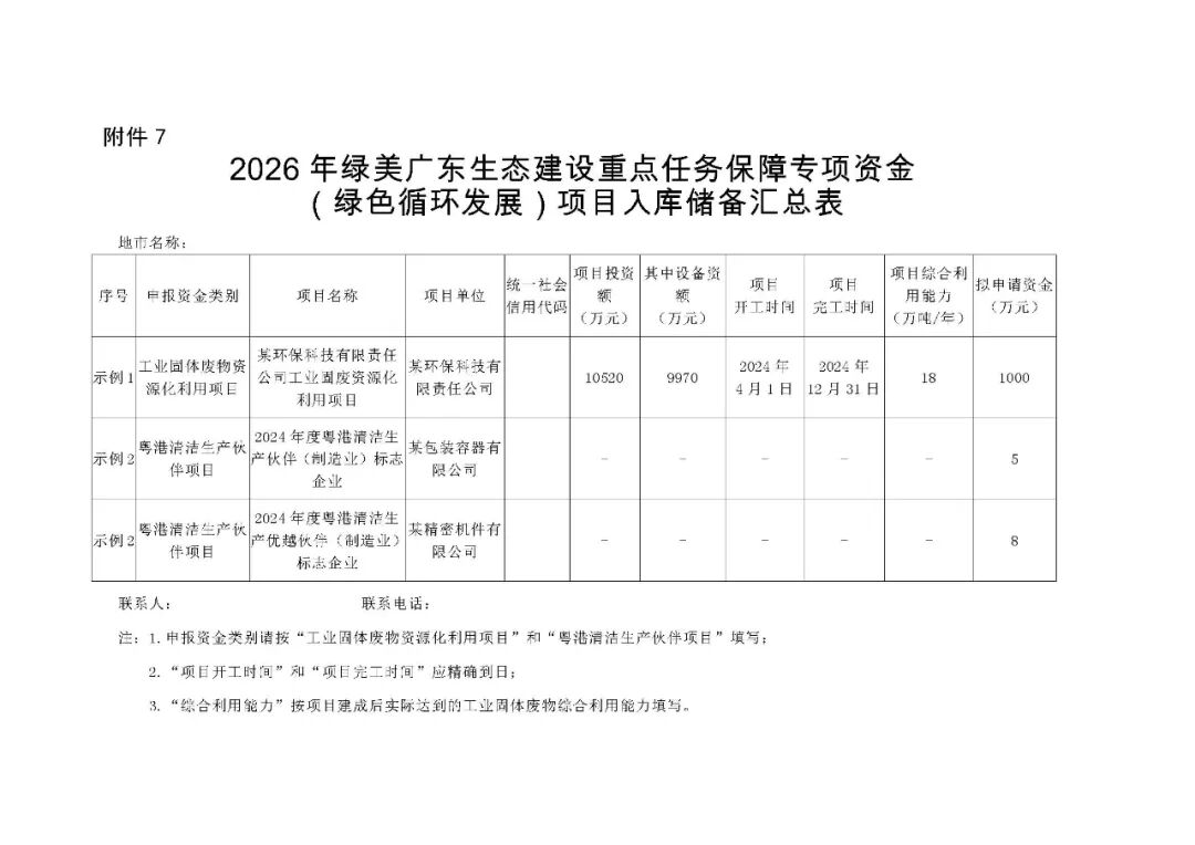 根据《广东省工业和信息化厅经管省级财政专项资金管理办法(2024年修订)》(粤财工〔2024〕17号)、《广东省工业和信息化厅省级财政资金项目库管理办法》(粤工信办函〔2020〕25号)等要求,为做好2026年绿美广东生态建设重点任务保障专项资金(绿色循环发展)项目入库储备工作,现将有关事项通知如下: