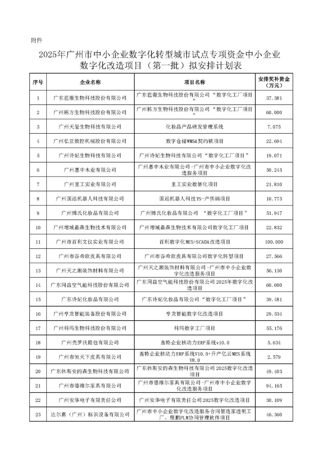 附件:2025年广州市中小企业数字化转型城市试点专项资金中小企业数字化改造项目(第一批)拟安排计划