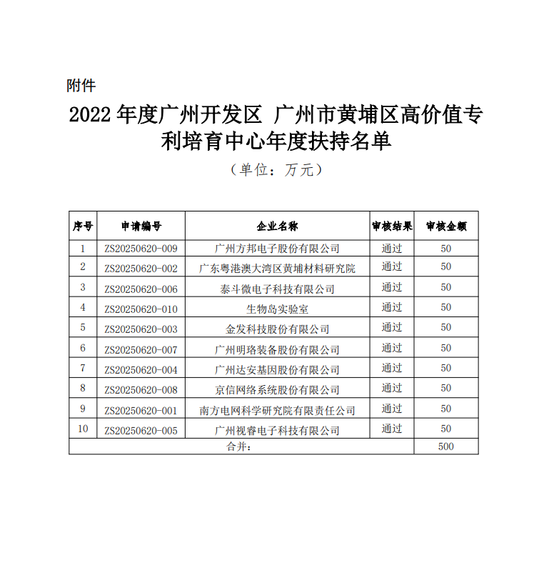 广州方邦电子股份有限公司等10家企业的10项“免申即享”项目符合2022年度广州开发区 广州市黄埔区高价值专利培育中心年度扶持政策规定,按程序予以发放资助费用人民币共计伍佰万元整(¥5,000,000)。请有关单位收到通知后,于2025年7月7日(星期一)至7月9日(星期三),登陆黄埔兑现通-政策兑现综合服务平台http://zcdx.gdd.gov.cn/,上传《收款确认函》(模板可在兑现系统中自行下载),在线办理资金拨付申请,逾期未办理的,视为放弃本次资助。