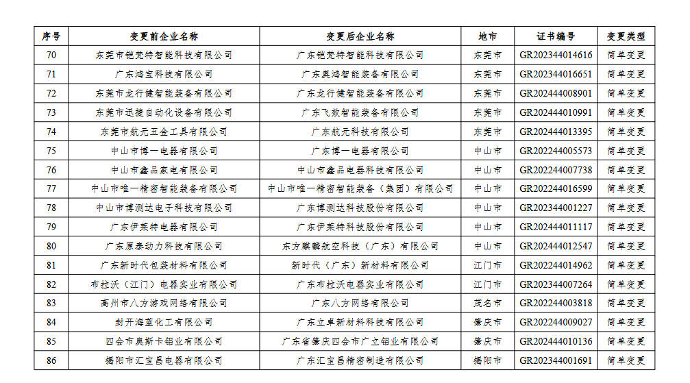 根据《高新技术企业认定管理办法》(国科发火〔2016〕32号)和《高新技术企业认定管理工作指引》(国科发火〔2016〕195号)的有关要求,经企业申请、专家评审、认定办商议等环节,广东云智软件有限公司等86家企业更名后仍符合高新技术企业认定条件。现对该批拟更名的高新技术企业名单(见附件)予以公示,公示期为10个工作日。