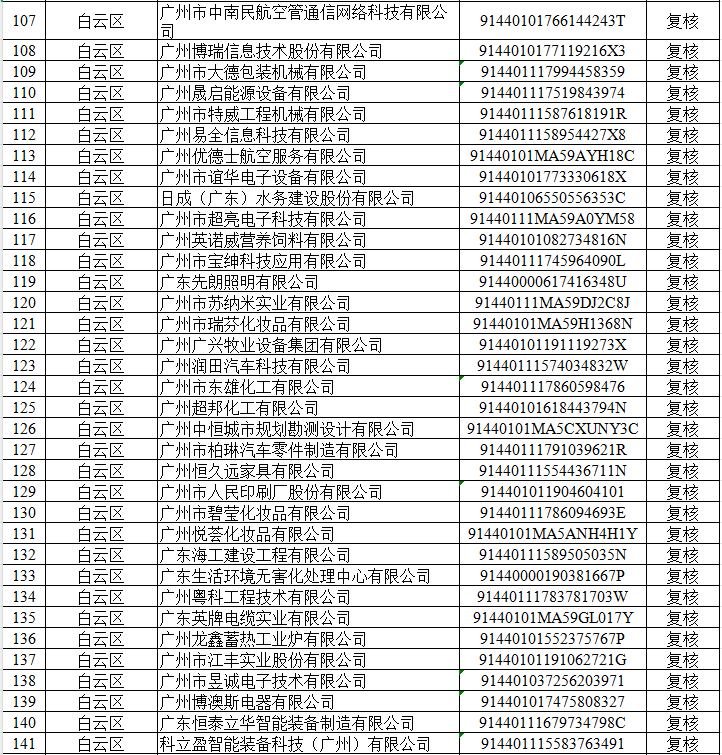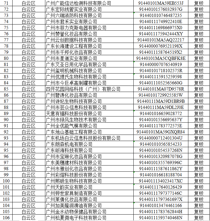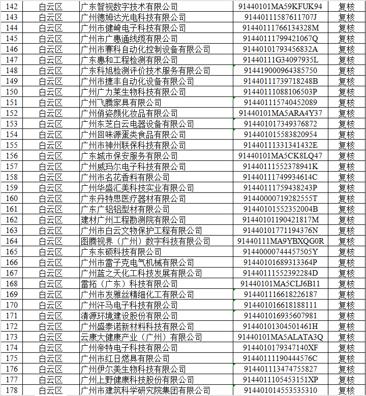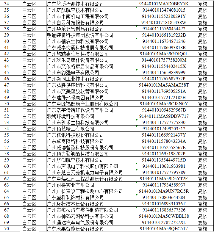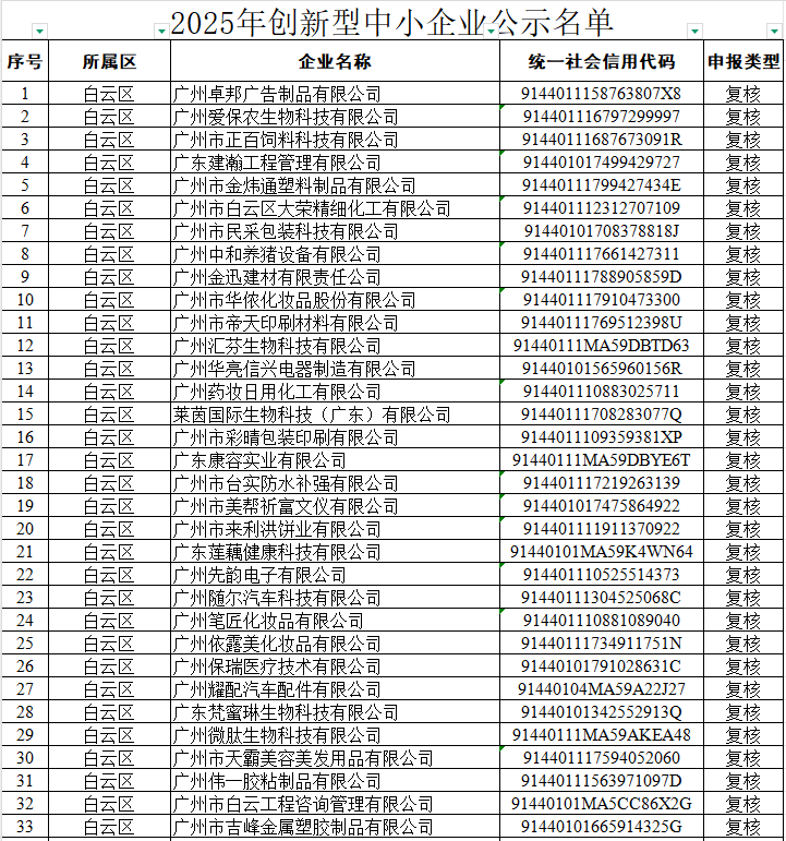 根据《广东省优质中小企业梯度培育管理实施细则》和《广州市工业和信息化局关于组织开展2025年创新型中小企业评价(复核)和专精特新中小企业认定(复核)工作的通知》(粤工信融资函〔2025〕4 号)相关要求,我局按要求组织开展了2025年创新型中小企业评价(复核)工作,并在2025年7月29日至8月4日期间进行拟公示,拟公示异议均已处理完毕,现将通过审核的4012家创新型中小企业予以公示。