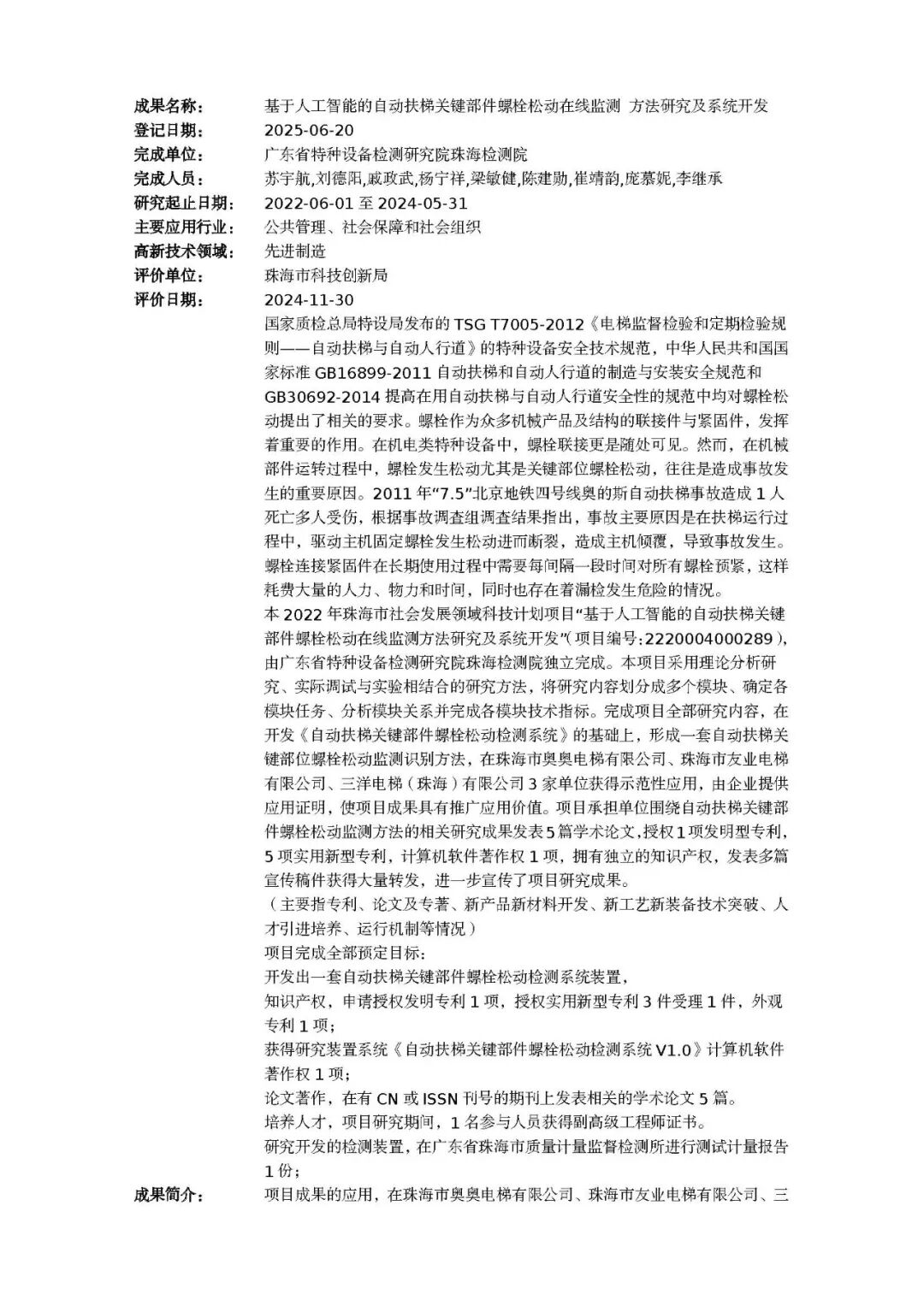 根据《广东省科学技术厅关于科技成果登记与信息公开的实施办法》的规定,现对“人工智能的自动扶梯关键部件螺栓松动在线监测系统”科技成果登记信息进行为期30天的公示。对本期公示有异议者,可自公示之日起30日内以真实署名和书面形式向市科技局提出,逾期不予受理(联系人:黄志祥,电话:0756-2113263 ,地址:珠海市香洲区人民东路125号工商大厦 市科技创新局5楼520房 )。