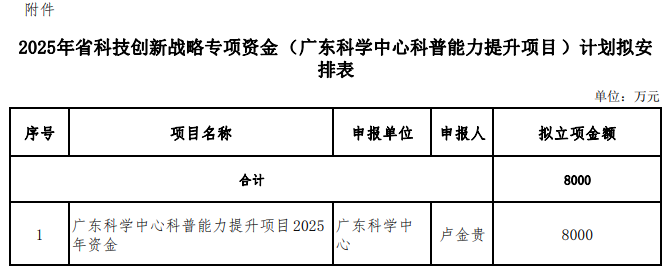 根据省级财政专项资金管理办法有关规定,拟安排广东科学中心科普能力提升项目合计8000万元。现予以公示,公示期自2025年9月10—16日。