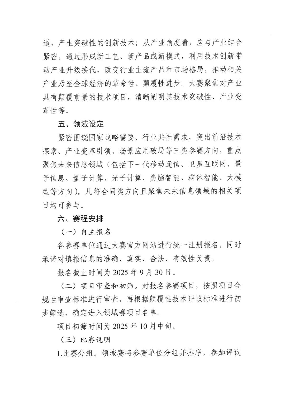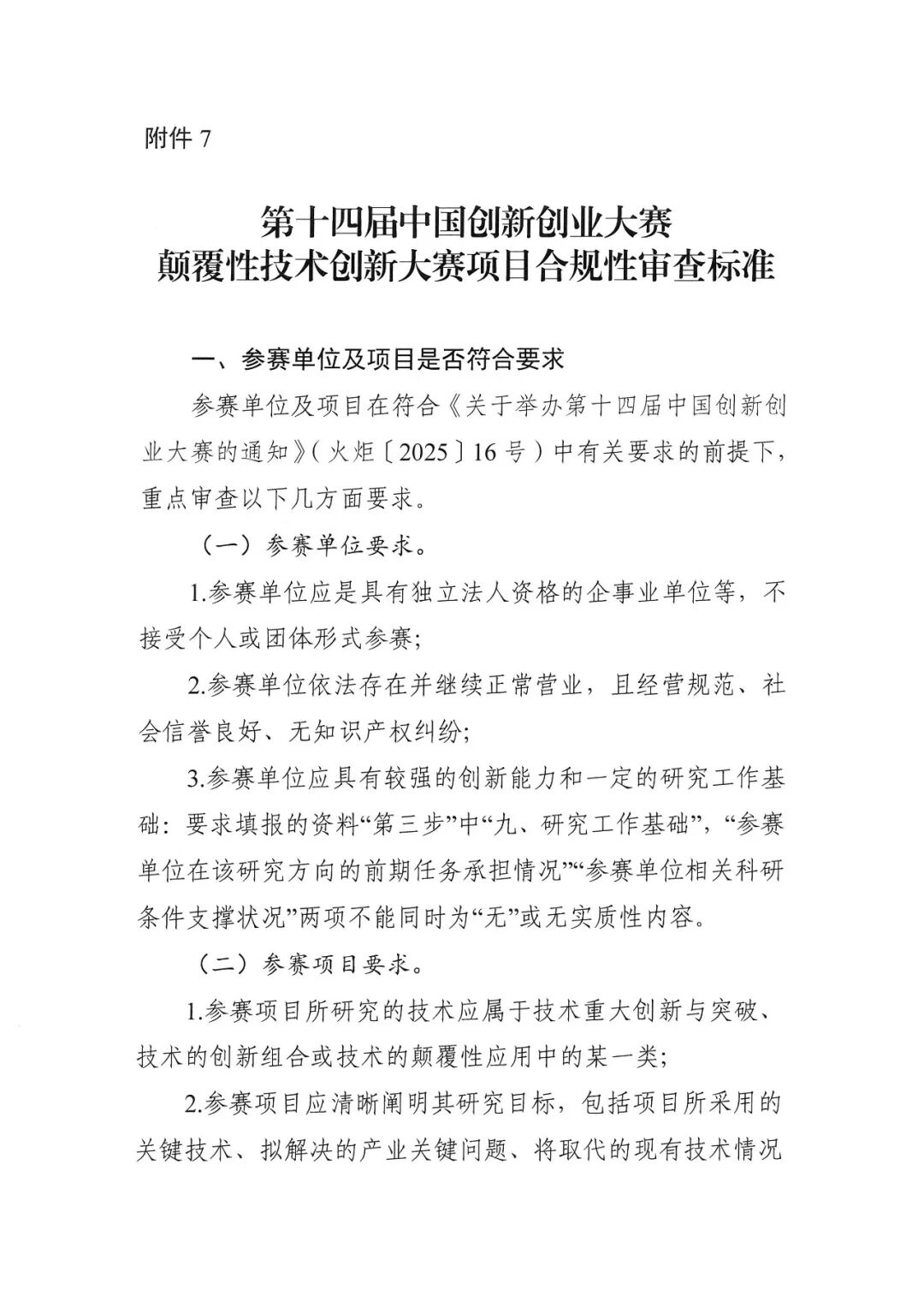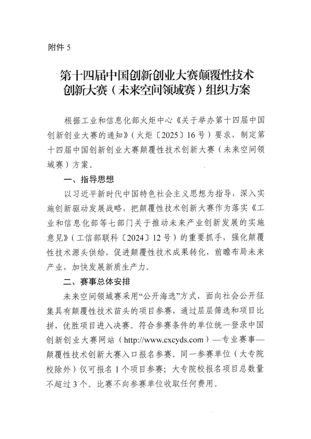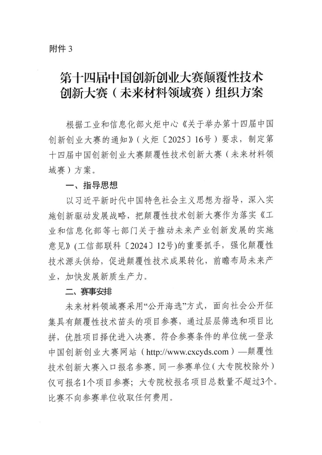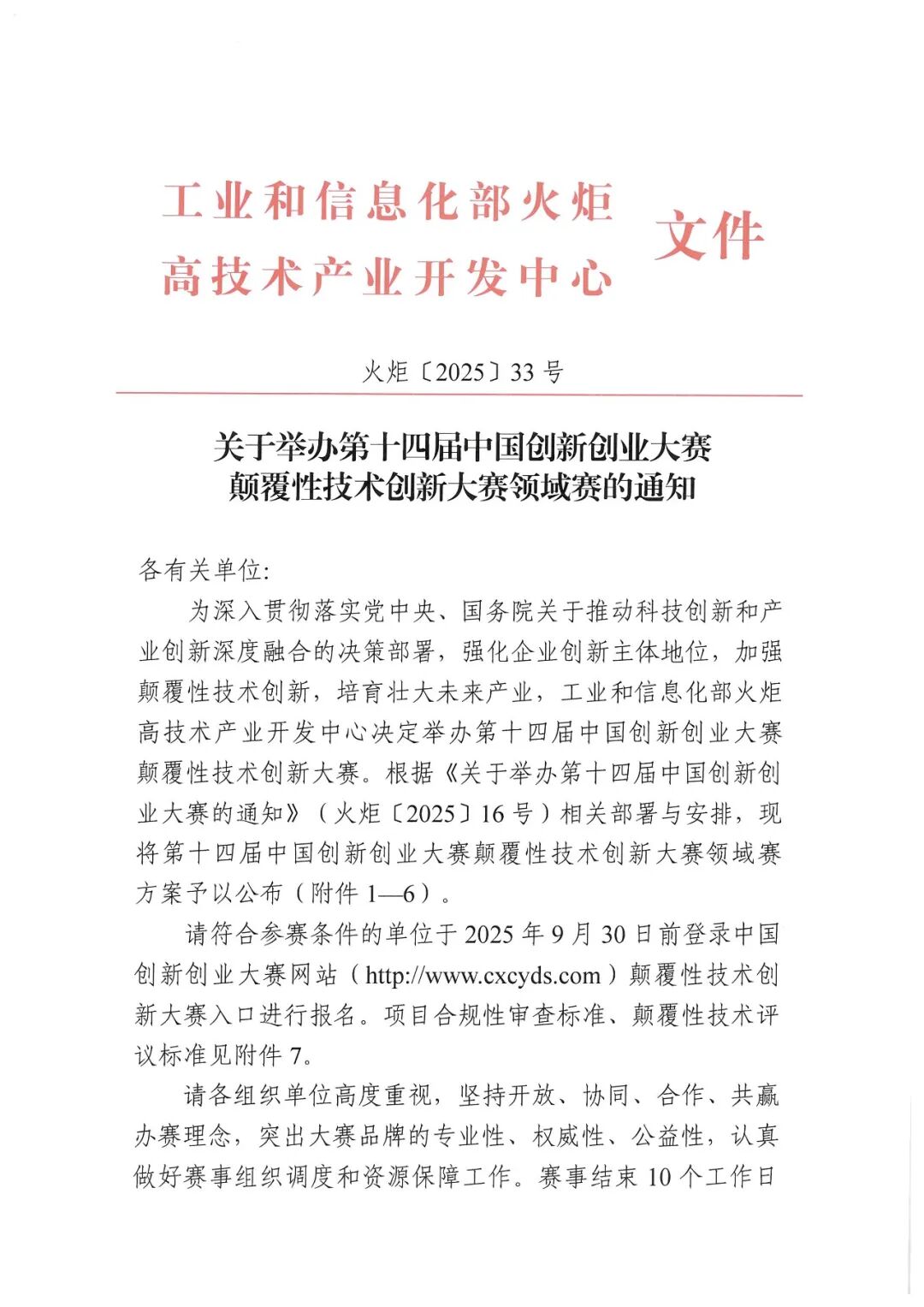 现转发工业和信息化部高技术产业开发中心《关于举办第十四届中国创新创业大赛颠覆性技术创新大赛领域赛的通知》(火炬〔2025〕33号),请各单位高度重视,积极发动本地区符合参赛条件的单位参赛,于2025年9月30日前登录中国创新创业大赛网站(http://www.cxcyds.com)颠覆性技术创新大赛入口完成报名。
