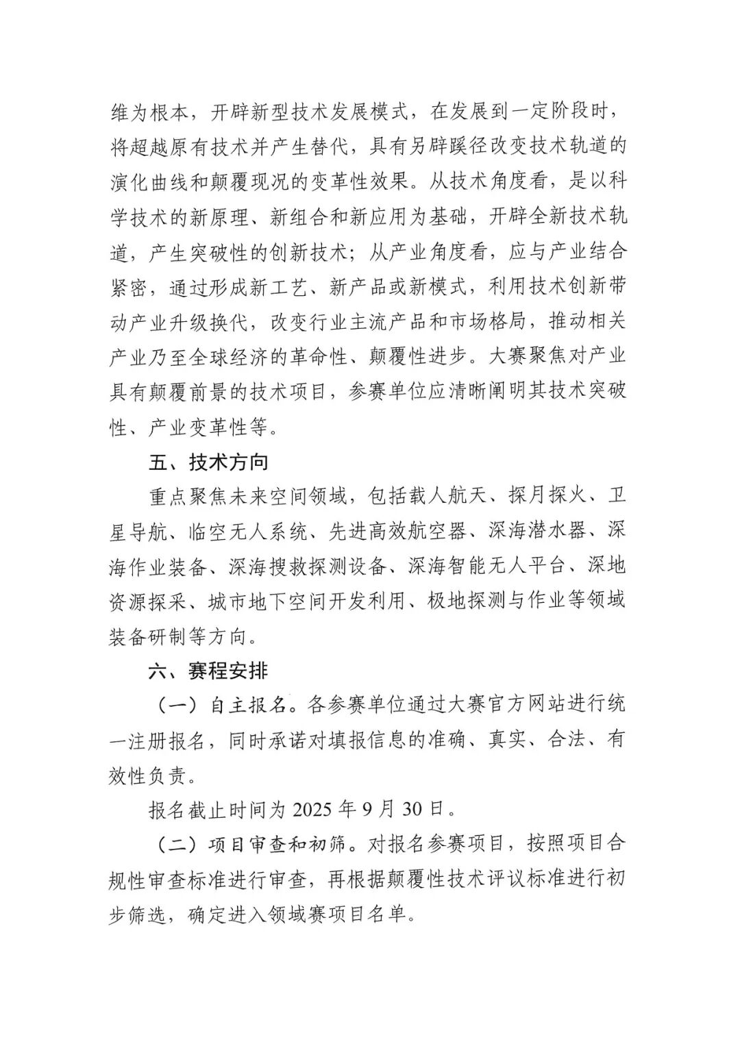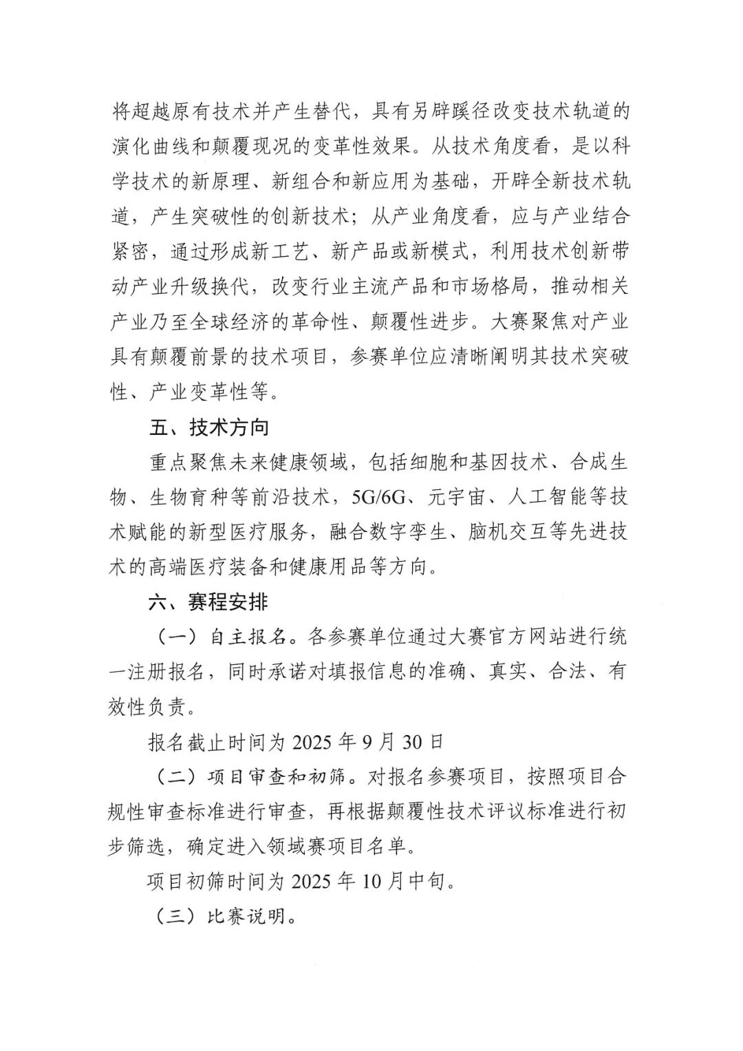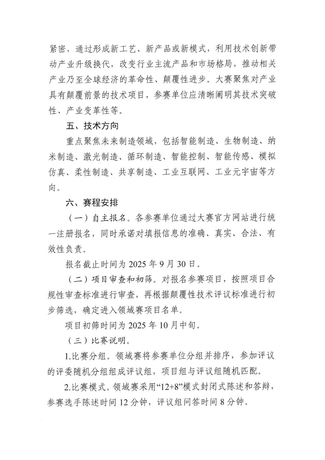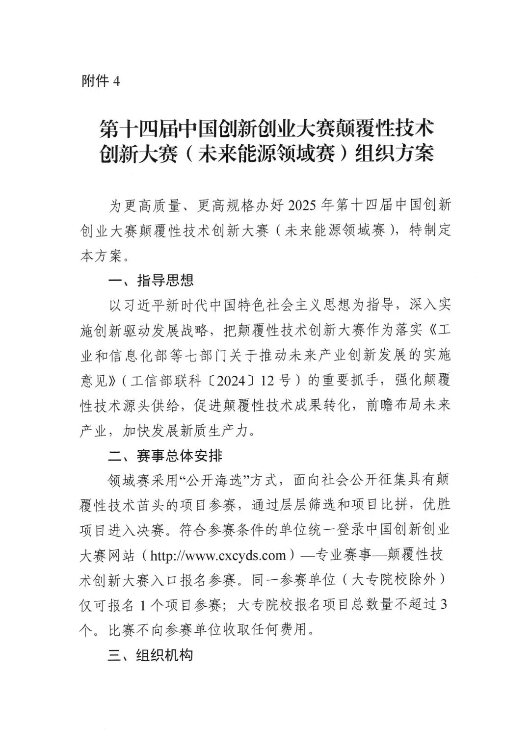 现转发工业和信息化部高技术产业开发中心《关于举办第十四届中国创新创业大赛颠覆性技术创新大赛领域赛的通知》(火炬〔2025〕33号),请各单位高度重视,积极发动本地区符合参赛条件的单位参赛,于2025年9月30日前登录中国创新创业大赛网站(http://www.cxcyds.com)颠覆性技术创新大赛入口完成报名。
