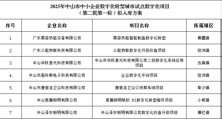 根据《中山市中小企业数字化转型城市试点工作方案》等相关文件精神,我局组织了2025年中山市中小企业数字化转型城市试点数字化项目(第二批)入库申报工作。经镇街工信部门审核、科室审查、专家评审等程序,形成了2025年中山市中小企业数字化转型城市试点数字化项目(第二批第一轮)拟入库方案,现予以公示(见附件)。