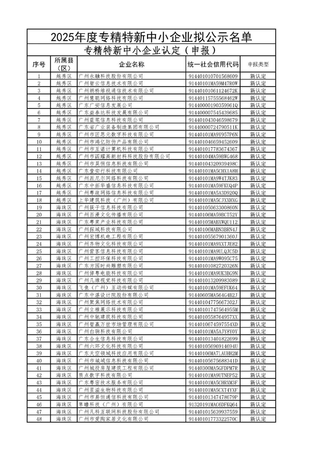 根据《广州市工业和信息化局关于组织开展2025年创新型中小企业评价(复核)和专精特新中小企业认定(复核)工作的通知》《广东省优质中小企业梯度培育管理实施细则》相关要求,我局按要求开展了2025年专精特新中小企业评审工作,现将拟通过认定(复核)的2025年专精特新中小企业名单予以拟公示,最终通过名单将在拟公示无异议后再行公示。
