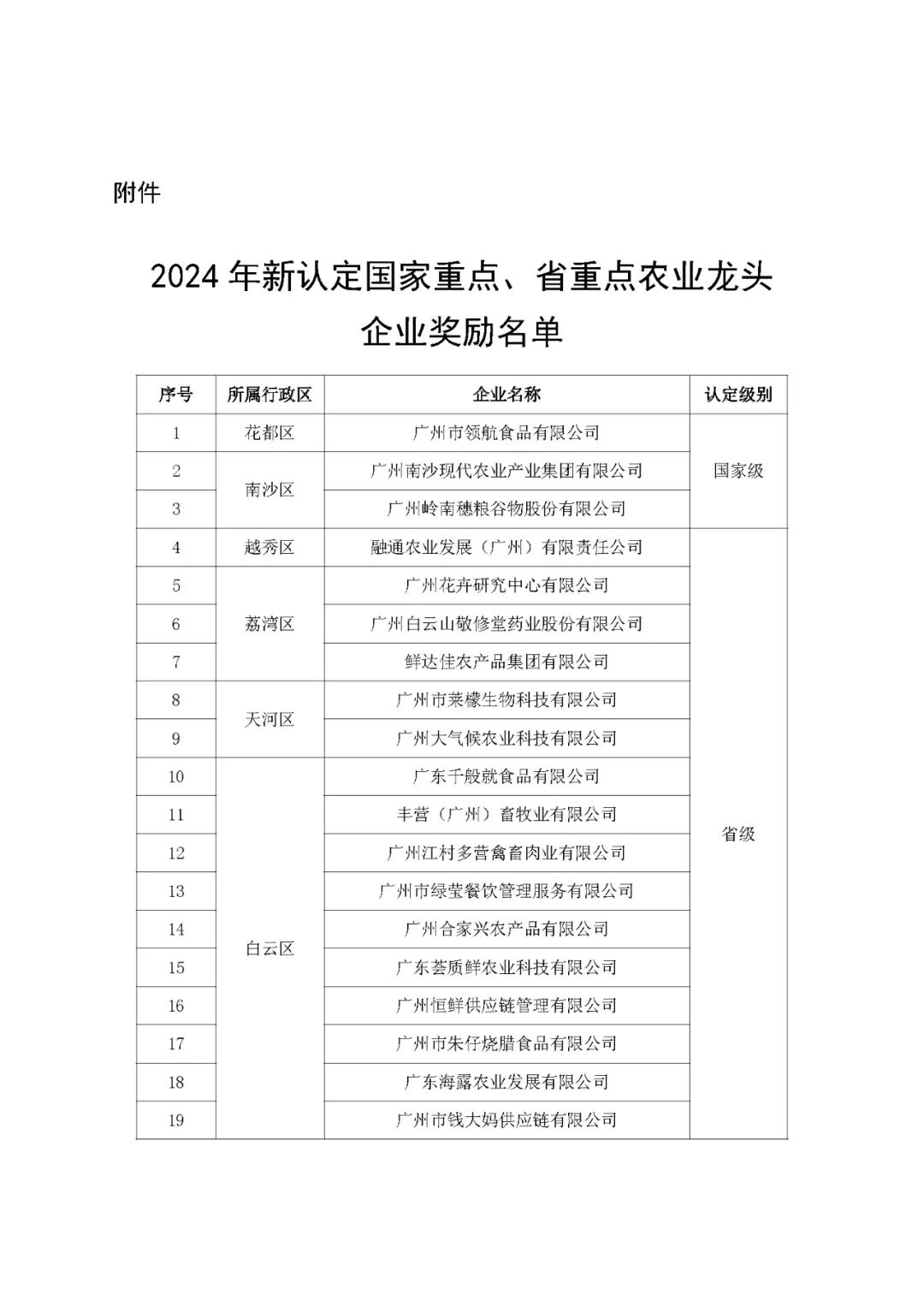 根据《广州市农业农村局关于印发广州市农业龙头企业奖励资金管理暂行办法的通知》(穗农规字〔2023〕4号)有关要求,拟对我市2024年度首次获得认定的国家重点、省重点农业龙头企业给予奖励。经申请确认,现将2024年新认定国家重点、省重点农业龙头企业奖励名单进行公示,公示期自2025年10月16日至2025年10月22日,共7天。