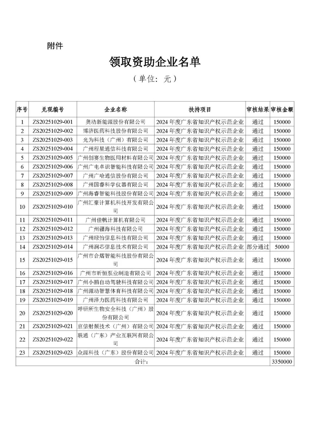 奥动新能源汽车科技有限公司等23家企业的知识产权示范优势企业扶持(知识产权高质量发展30条)“免申即享”兑现事项符合《广州开发区 广州市黄埔区深化知识产权运用和保护综合改革试验促进高质量发展办法》(穗埔府规〔2023〕5号)第五条及相关办事指南规定,予以发放资助费用人民币共计叁佰叁拾伍万元整(¥3,350,000)。请有关单位收到通知后,于2025年11月7日(星期五)至11月11日(星期二),登陆黄埔兑现通-政策兑现综合服务平台http://zcdx.gdd.gov.cn/,上传《收款确认函》(模板可在兑现系统中自行下载),在线办理资金拨付申请,逾期未办理的,视为放弃本次资助。