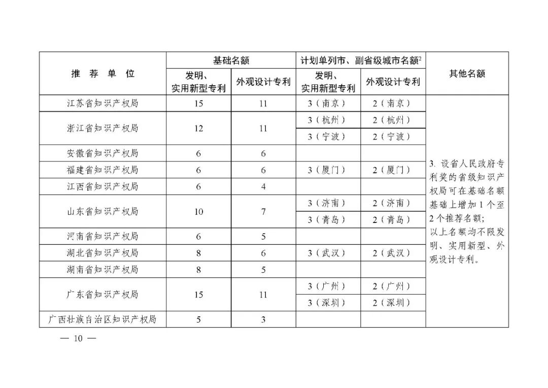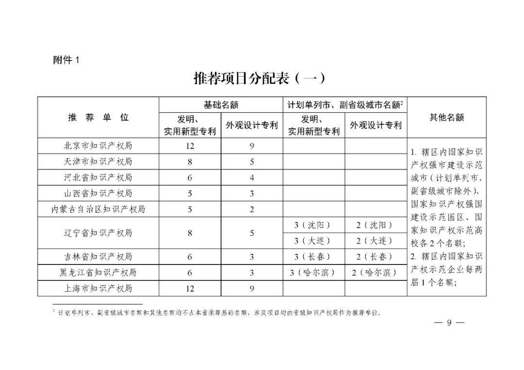 一、对拟使用省局、全国性行业协会、院士、计划单列市、副省级城市、国家知识产权强市建设示范城市、国家级知识产权强国建设示范园区推荐名额及国家知识产权示范高校、示范企业自荐名额的项目,全部通过申报单位或个人所在地市市场监管局统一报送省局。请各市局高度重视,认真组织,对本辖区上述项目的参评条件、报送材料、推荐程序、公示情况等进行审核,确保相关材料完整、真实、准确,不存在涉密内容。
