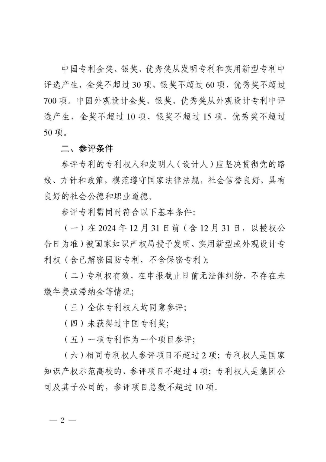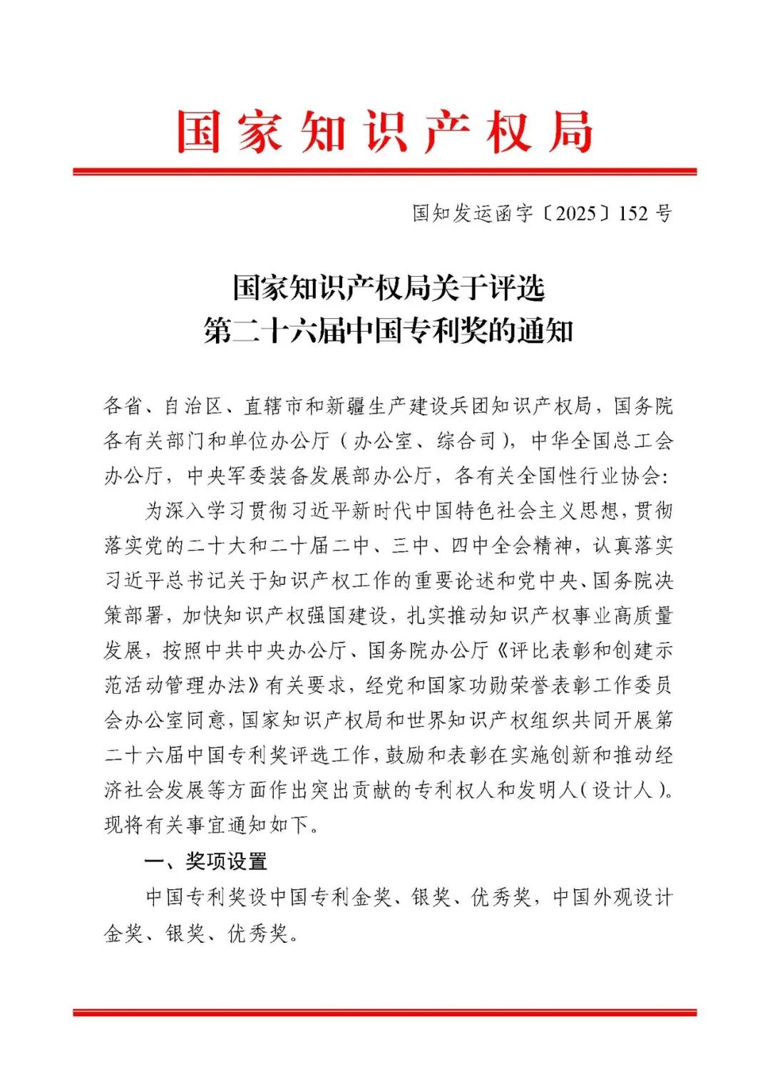 根据《国家知识产权局关于评选第二十六届中国专利奖的通知》(国知发运函字〔2025〕152号,以下简称《通知》,见附件),第二十六届中国专利奖评选工作已启动。为做好我省参评项目的组织和推荐工作,现就有关事项通知如下。
