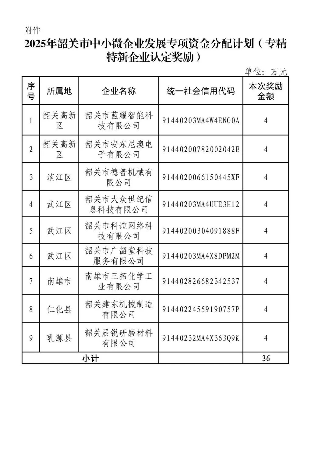 附件:2025年韶关市中小微企业发展专项资金分配计划(专精特新企业认定奖励)