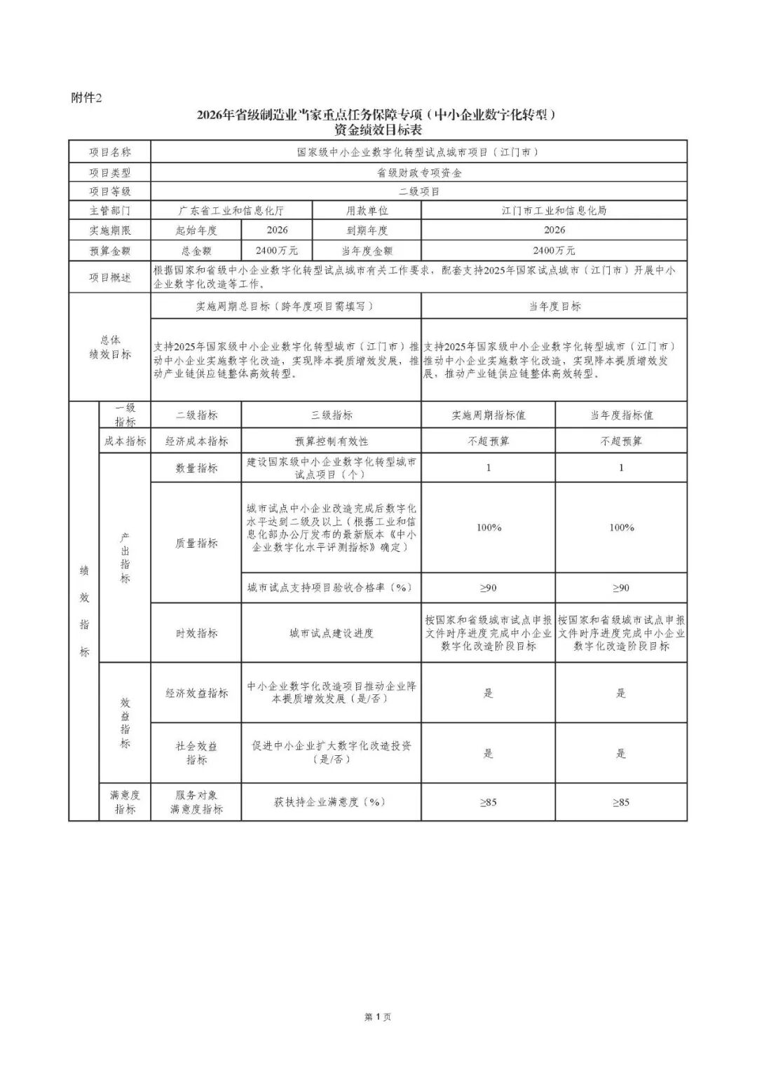 2.2026年省级制造业当家重点任务保障专项(中小企业数字化转型)资金绩效目标表