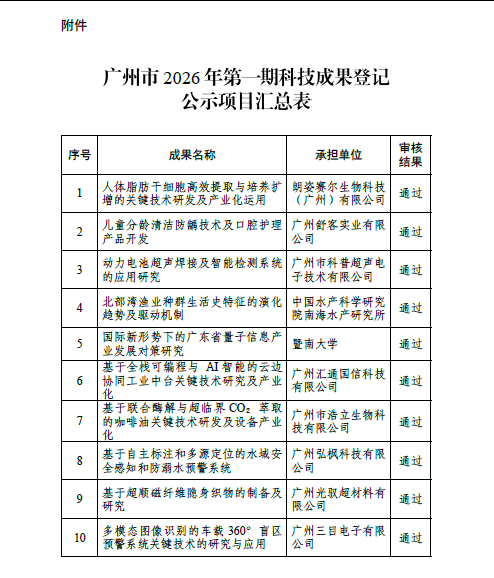 附件:广州市2026年第一期科技成果登记公示项目汇总表