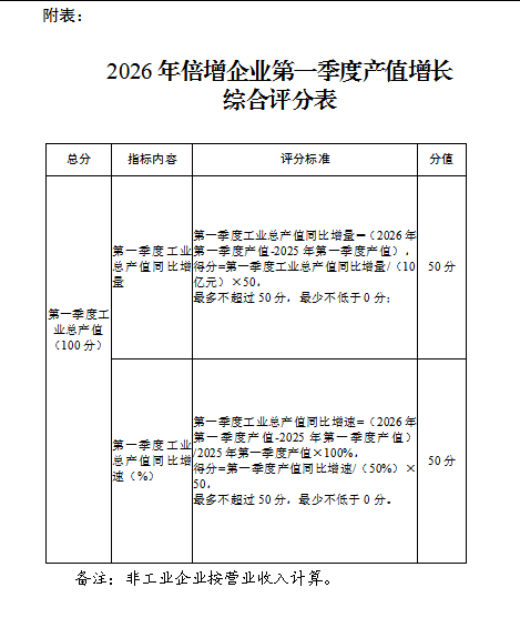 为鼓励和引导企业在春节前后早复工、早达产,我局根据相关文件精神,开展2026年倍增企业稳产复产奖项目预申报工作,结合倍增企业2026年一季度产值增长综合评分排名,从高到低择优分档给予倍增企业最高50万元资助。现请各园区、镇(街)工业和信息化主管部门做好政策宣传工作,主动服务企业,为全市实现一季度经济“开门红”,发挥倍增企业支撑保障作用。
