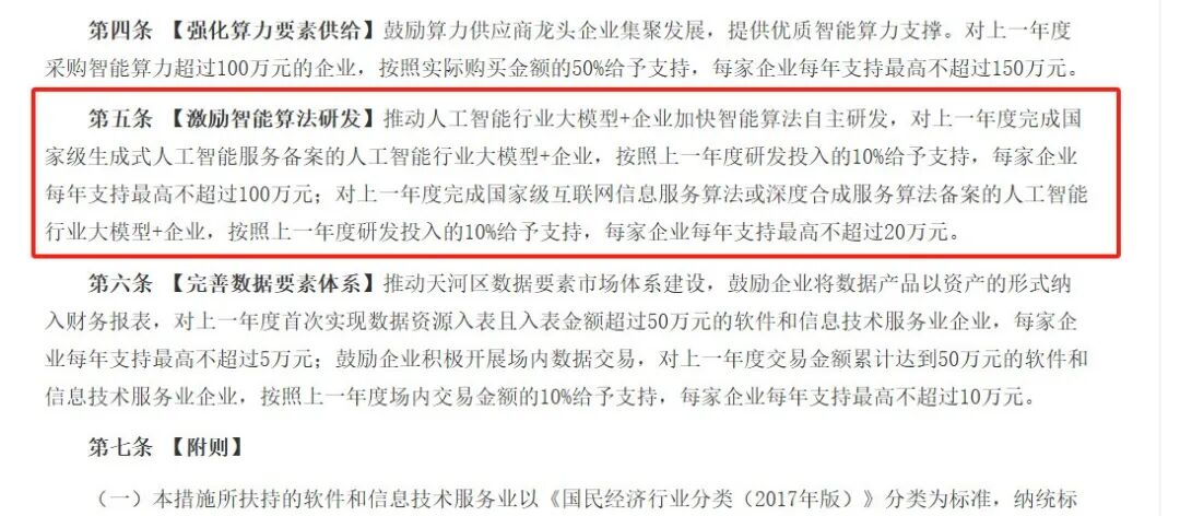 2.天河区:对上一年完成大模型/算法备案的企业,可按研发投入的10%分别给予支持,每家企业每年奖补限额分别为100万元、20万元。