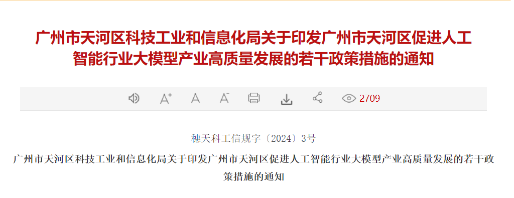 政策文件:《广州市天河区科技工业和信息化局关于印发广州市天河区促进人工智能行业大模型产业高质量发展的若干政策措施的通知》