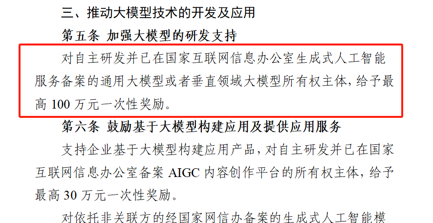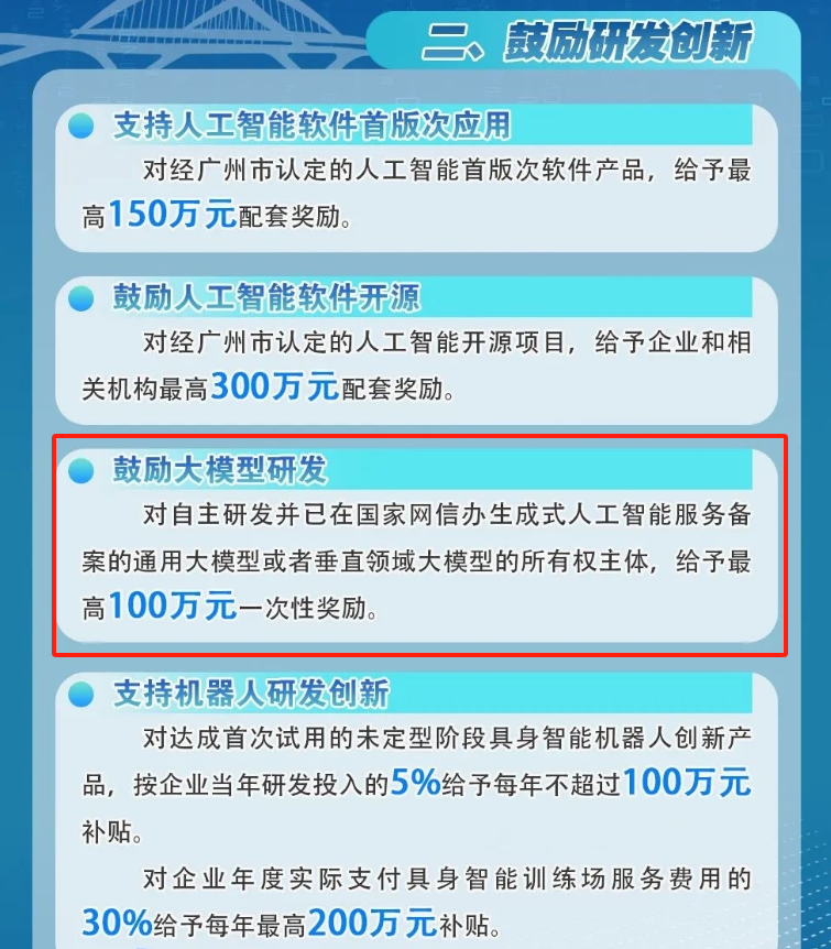 3. 南沙区:对已完成备案的通用大模型或者垂直领域大模型所有权主体,给予最高100万元一次性奖励。