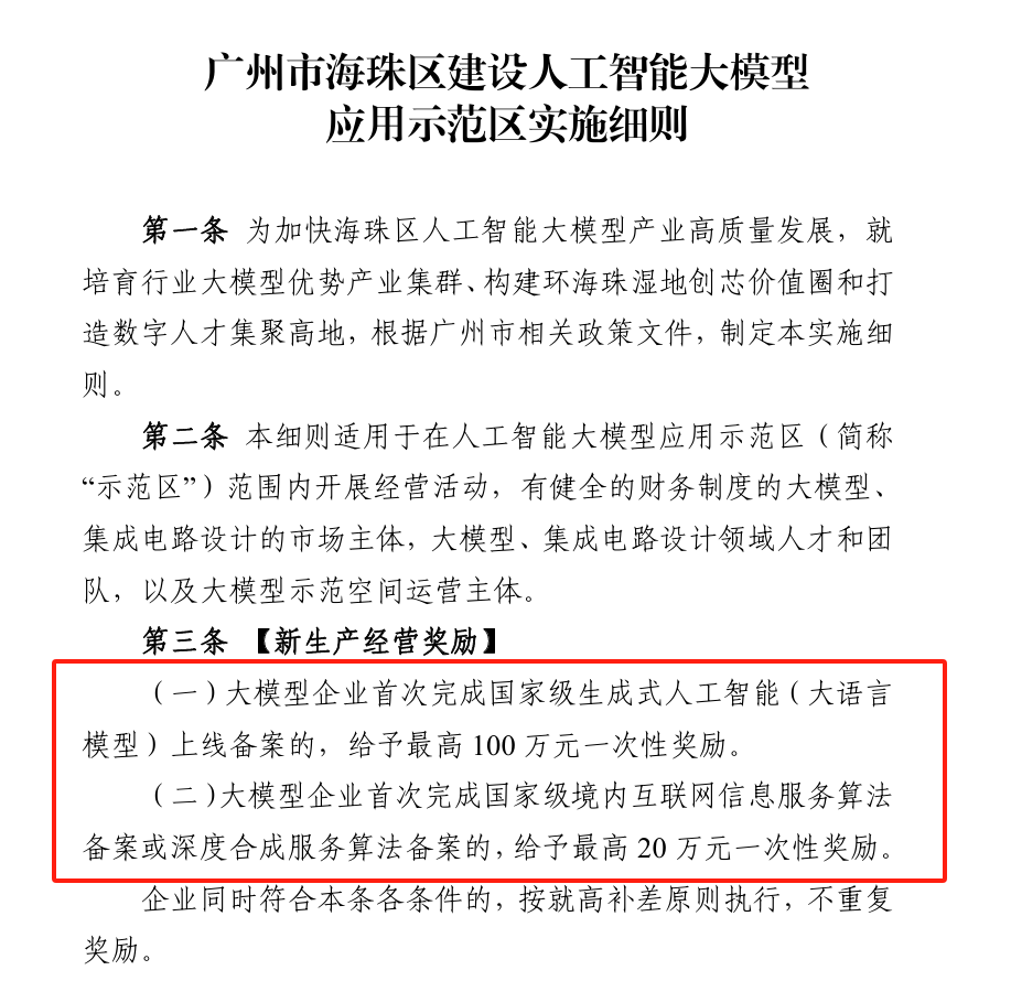 1.海珠区:大模型首次备案通过,给予最高100万元一次性奖励;算法首次备案通过,给予最高20万元一次性奖励。