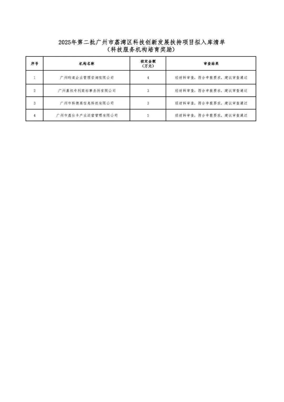 根据《广州市荔湾区进一步促进科技创新发展扶持办法(试行)》的文件要求,我局2025年开展了第二批广州市荔湾区科技创新发展扶持项目申报工作。经过公开受理、形式审查等程序,初步形成了《2025年第二批广州市荔湾区科技创新发展扶持项目拟入库清单》(见附件)。