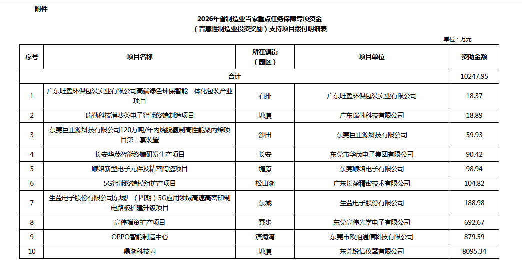 根据《东莞市落实省级先进制造业发展专项资金(普惠性制造业投资奖励)管理实施细则》,现将2026年省制造业当家重点任务保障专项资金(普惠性制造业投资奖励)10247.95万元拨付给你们(见附件)。请你们按照适用的会计准则,做好账目处理。如有问题,请及时向市工信局、市财政局反映。市工信局联系电话:22221295;市财政局联系电话:22830537。