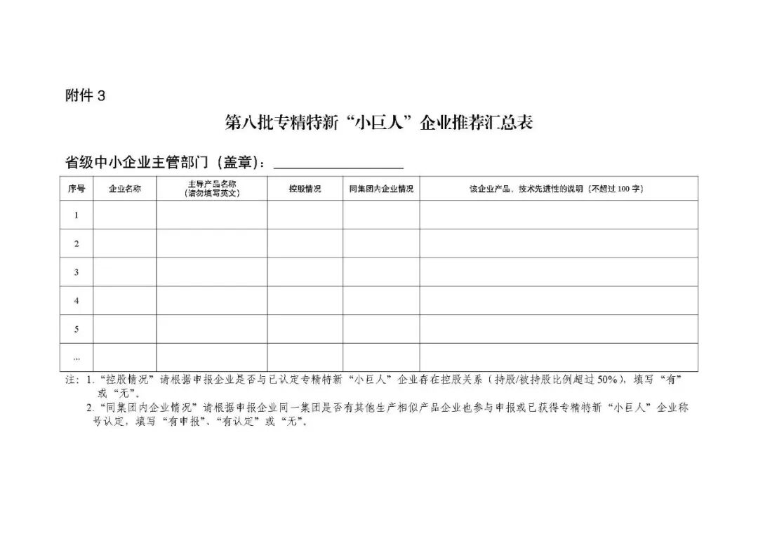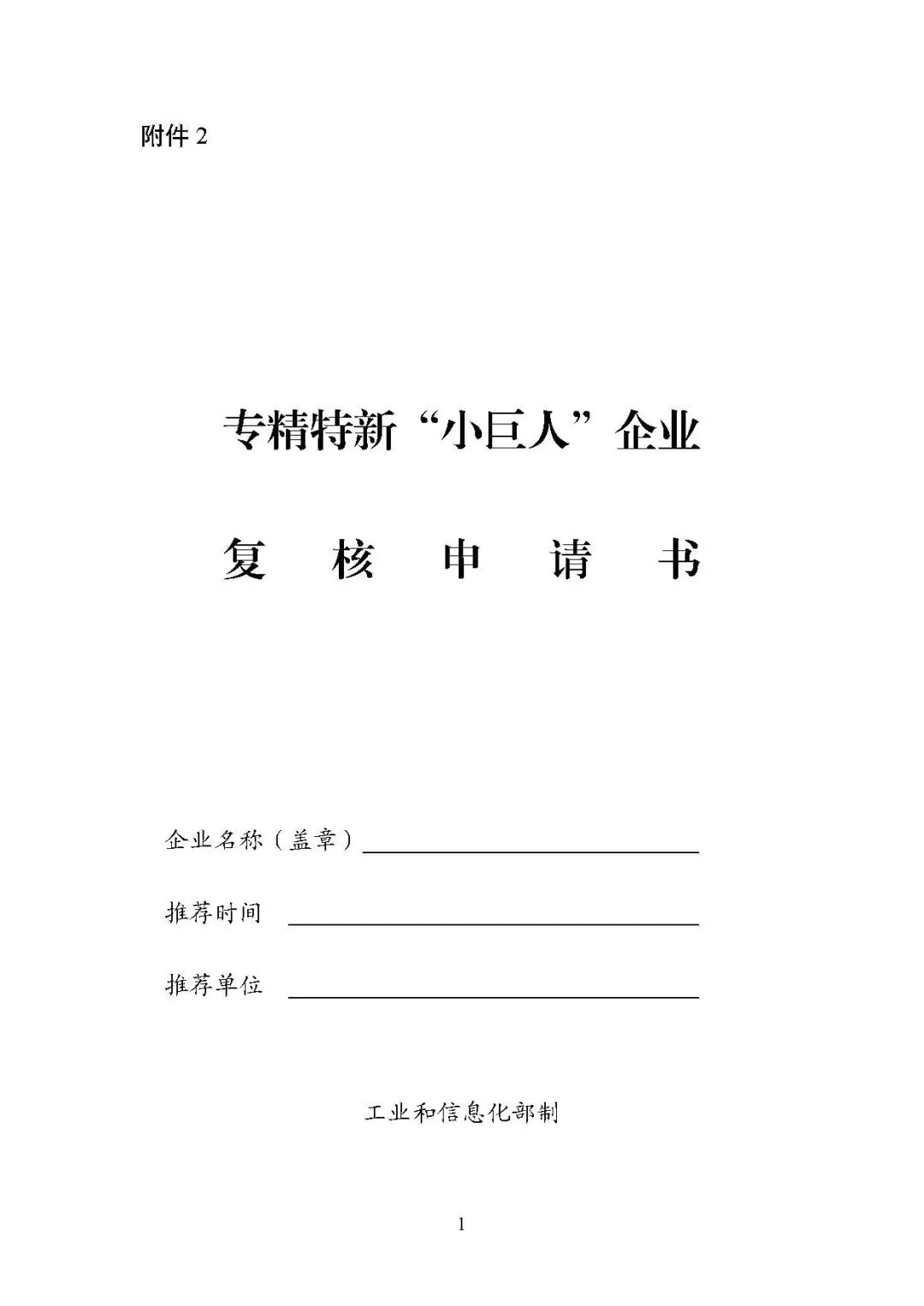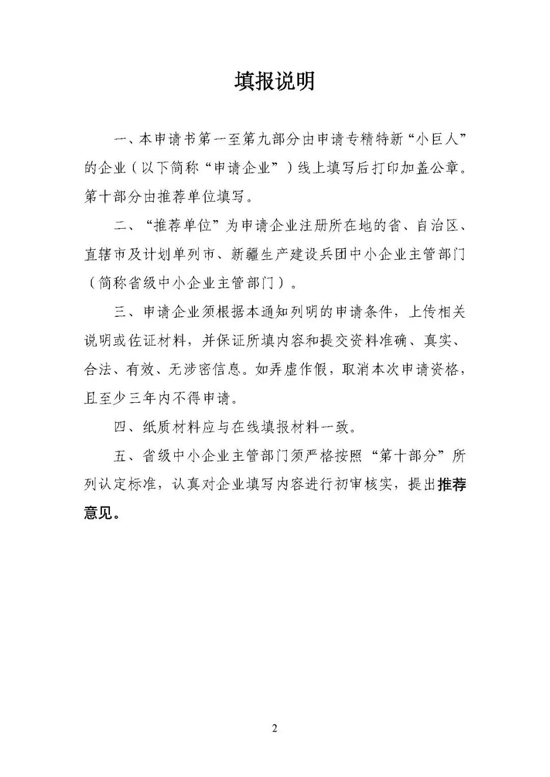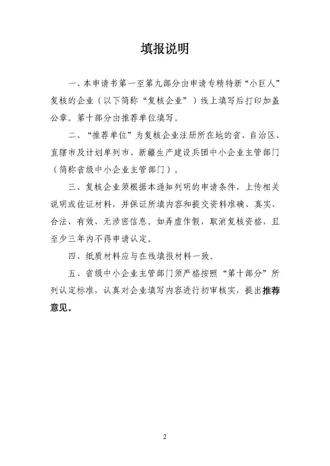 (二)要择优组织符合条件的企业填写“第八批专精特新‘小巨人’企业申请书”(附件1)或“专精特新‘小巨人’企业复核申请书”(附件2),并结合工作实际提出佐证材料要求,初审核实后提出推荐意见。