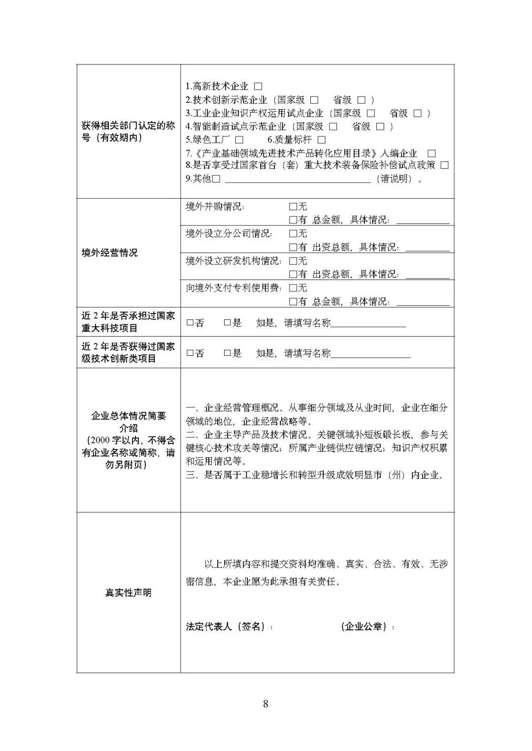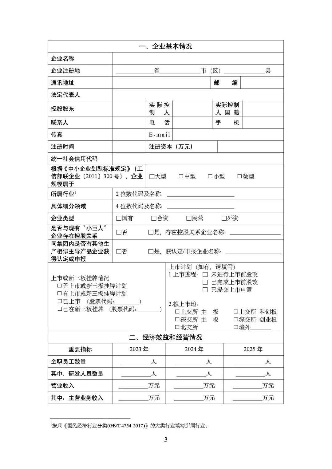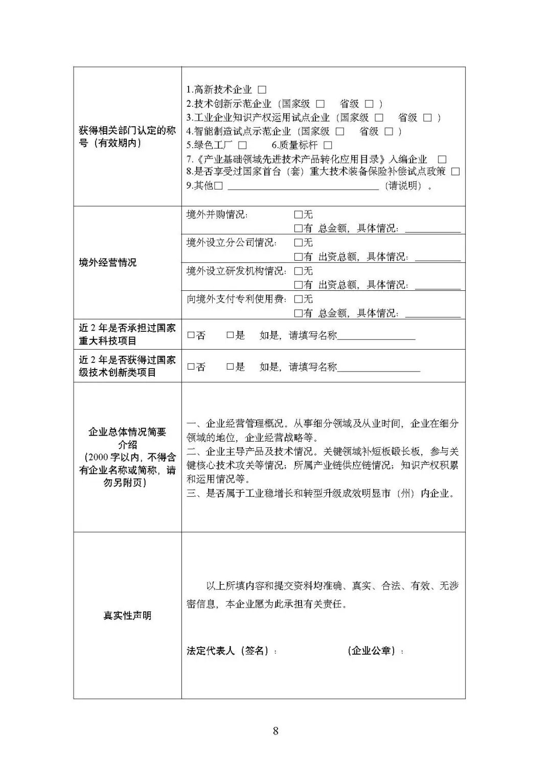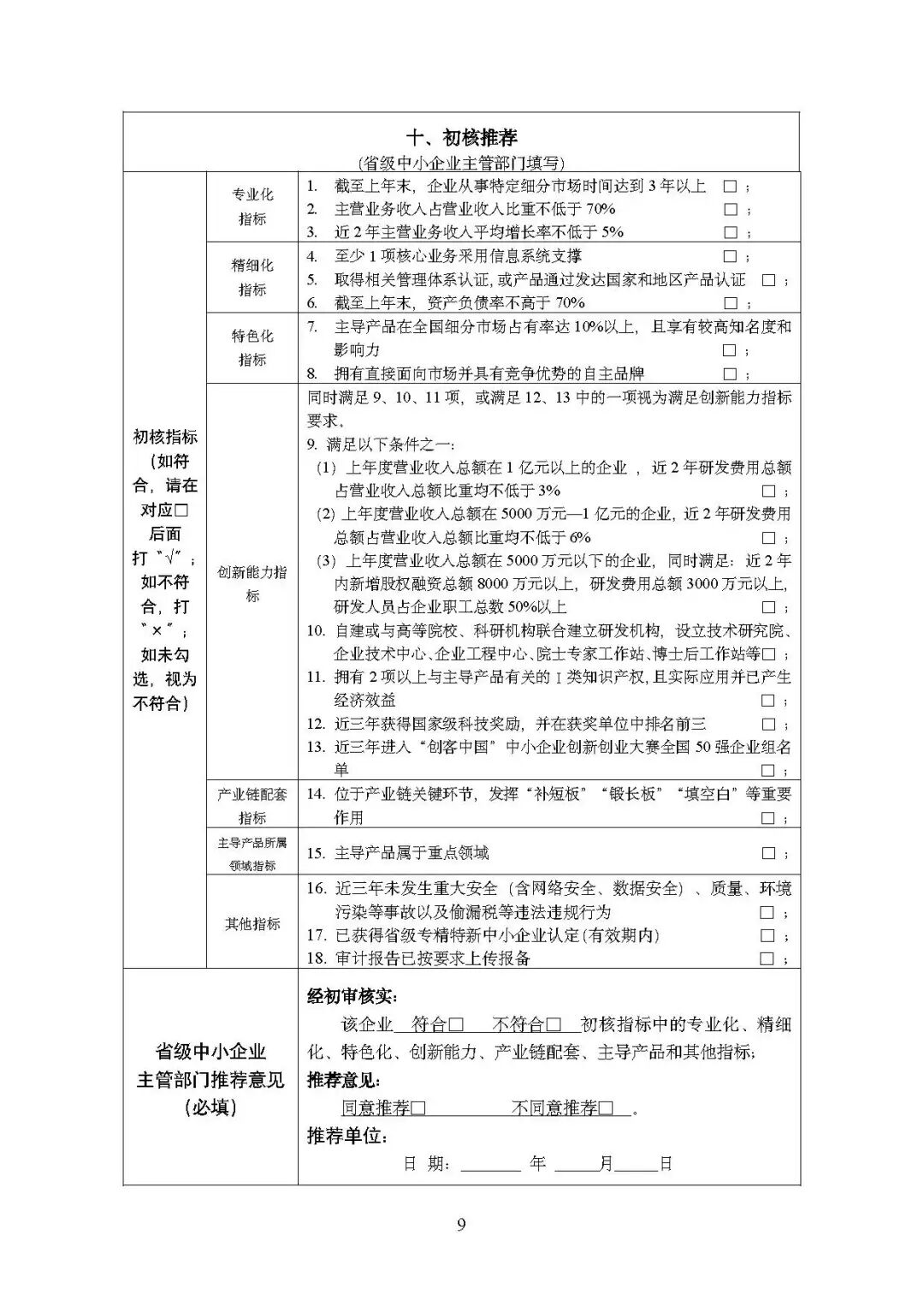 (二)要择优组织符合条件的企业填写“第八批专精特新‘小巨人’企业申请书”(附件1)或“专精特新‘小巨人’企业复核申请书”(附件2),并结合工作实际提出佐证材料要求,初审核实后提出推荐意见。