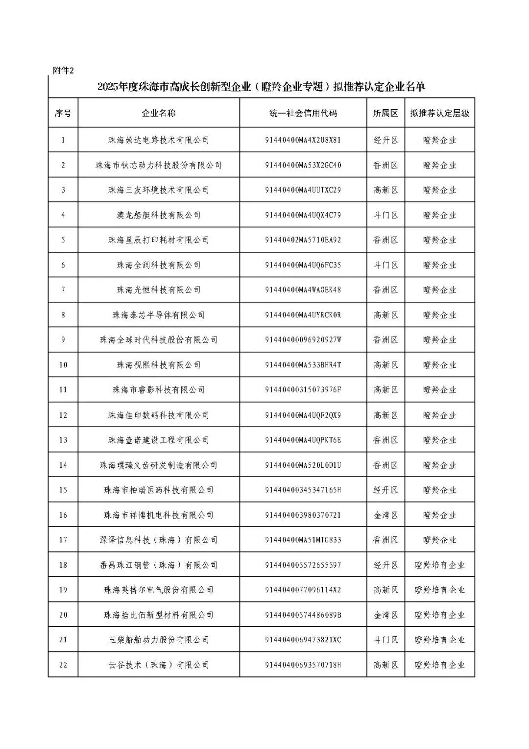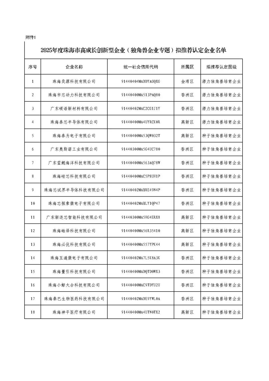 附件:1.2025年度珠海市高成长创新型企业(独角兽企业专题)拟推荐认定企业名单