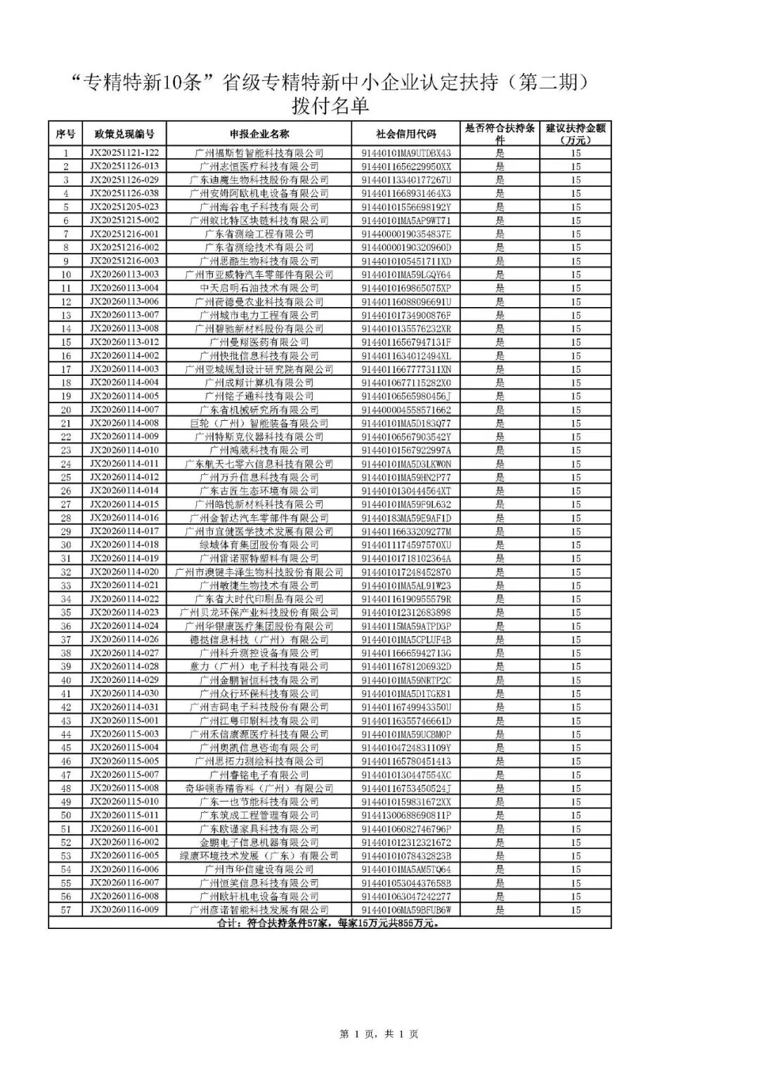 根据《广州市黄埔区 广州开发区进一步支持专精特新企业高质量发展办法》(穗埔工信规字〔2021〕5号)和《广州市黄埔区 广州开发区进一步支持专精特新企业高质量发展办法实施细则》(穗埔工信规字〔2021〕7号)文件精神,经审核、集体研究等程序,现拨付省级专精特新中小企业认定扶持(第二期)15万元/家,请各企业加强对资金使用的管理,严格执行相关法律法规及政策规定。