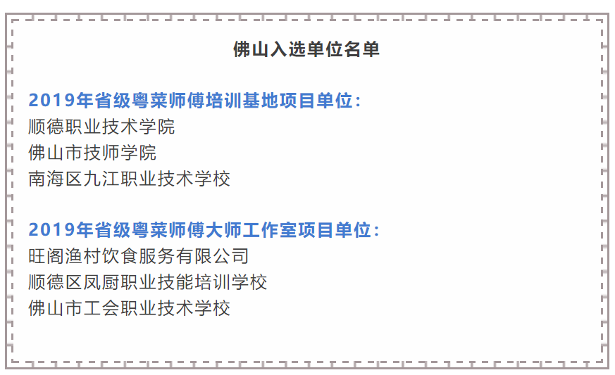 同时,市人社局也正在开展2019年市级“粤菜师傅”培训基地和大师工作室的选拔认定工作。拟扶持建设市级粤菜师傅培训基地4个、市级粤菜师傅大师工作室8个。对通过评审的项目,分别按照市级粤菜师傅培训基地每个60万元、市级粤菜师傅大师工作室每个10万元的标准给予一次性建设补助和补贴资金。