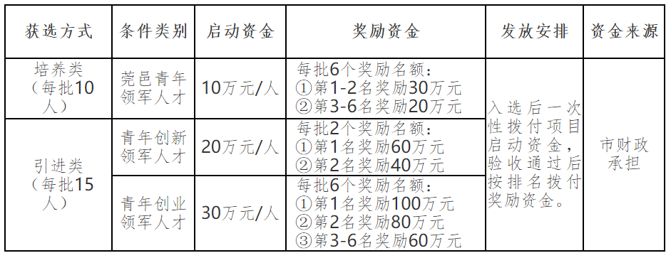 一是资金资助。资金资助由项目启动资金和奖励资金两部分组成。项目启动资金主要支持开展青年领军人才项目培一育实施、创新研发、团队建设等。奖励资金是对青年领军人才项目实施期满并通过市人力资源和社会保障局组织专家验收后,根据其技术项目绩效、行业带动、人才引进培养、营业额和税收等目标完成倩况进行综合排名,按排名给予奖励。奖励资金原则上应用于加大项目后续研发投入、改善团队福利及项目扩产等,不得用于与团队或项目无关的其它用途。资金资助由市人力资源和社会保障局拨付到人才所在单位,专款专用;资金资助标准如下: