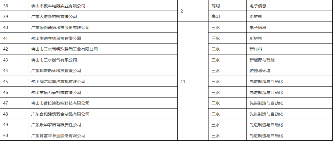 根据《佛山市高新技术企业树标提质行动计划(2018—2020年)》关于树立规模以上高新技术企业创新发展标杆的工作要求,我市开展了2019年佛山市标杆高新技术企业50强测评,对象为在佛山市内注册且截至2018年年底仍在有效期内的高新技术企业。通过数据测评、汇总、排序及各区推荐名单对比等环节,综合评定了2019年佛山市标杆高新技术企业50强。经市人民政府同意,现予以公布。